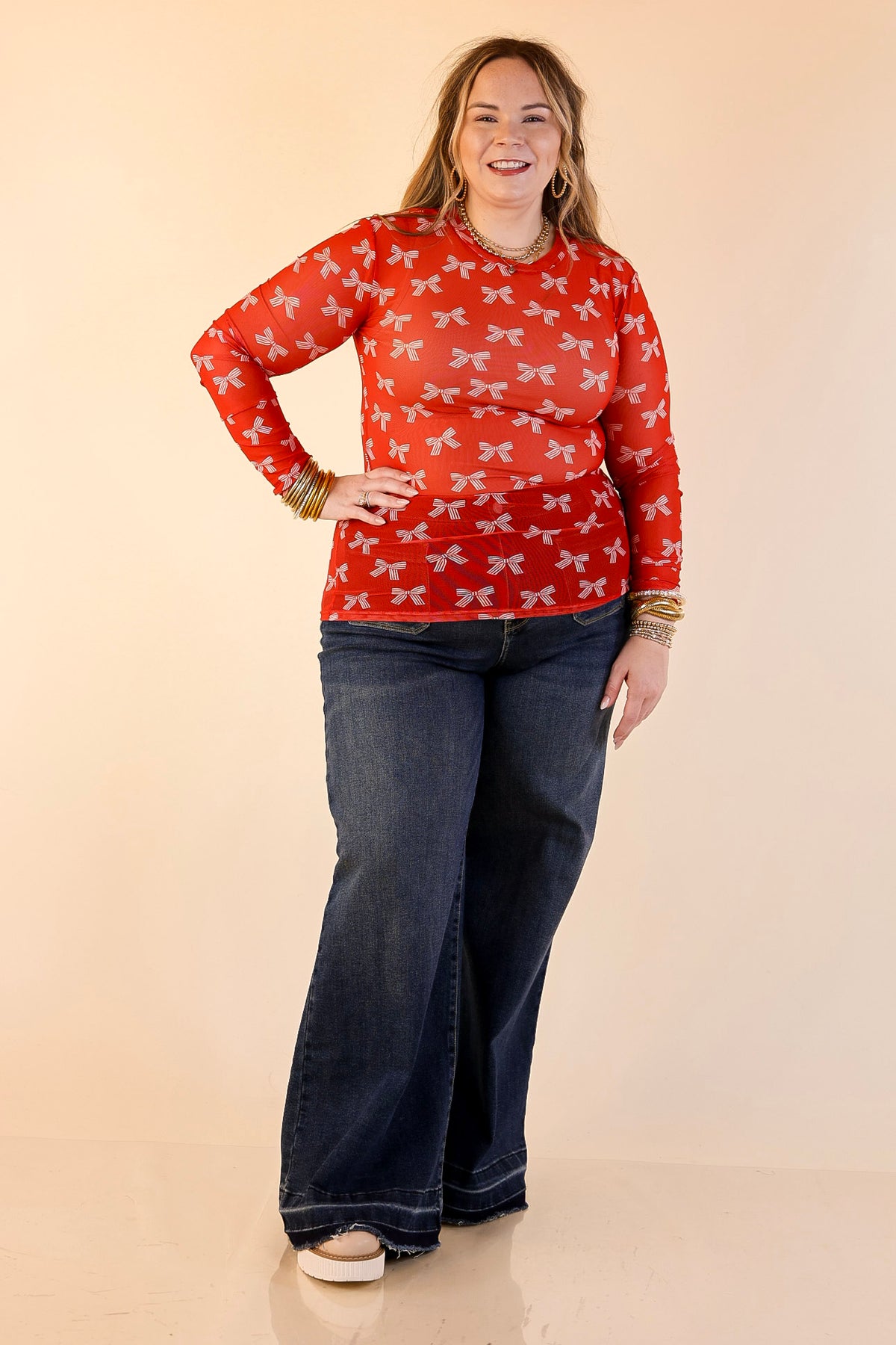 Models are wearing Bow Print Mesh Long Sleeve Top in Red and Ivory with blue jeans on a beige background