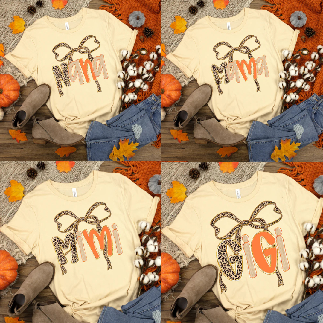 This playful short sleeve tee adds a fun twist with a bold leopard bow graphic, perfect for making a statement. Customize it with your favorite nickname—Mimi, Gigi, Mama, or Nana—each letter uniquely filled with either striking leopard print, vibrant solid orange, or soft solid tan. The creamy background complements these eye-catching colors, making this tee a versatile and stylish choice for casual days. Whether for yourself or a loved one, this exclusive design brings a personal touch and a splash of wild charm to your wardrobe.
