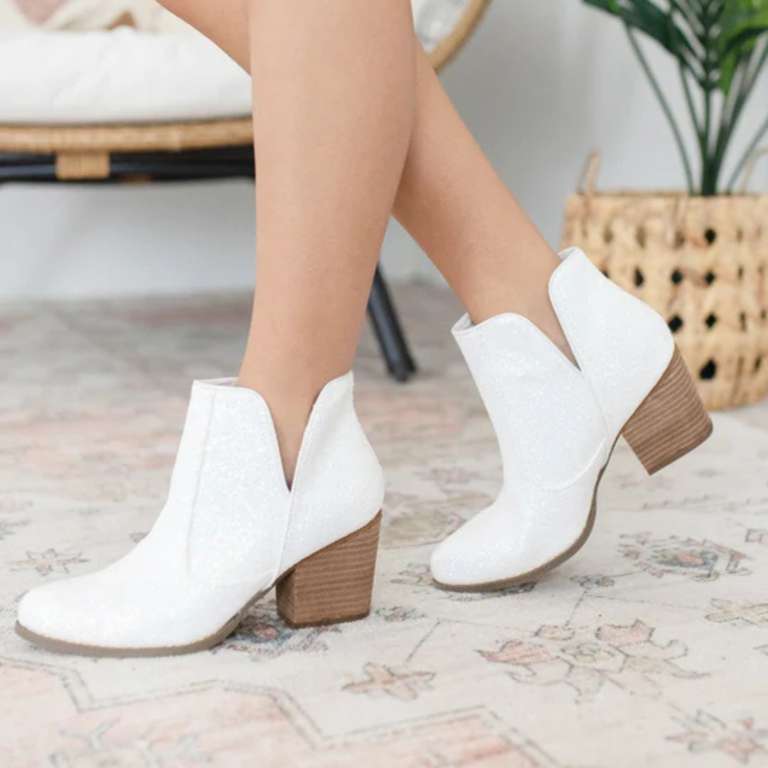 There’s no better way to make a statement than with a pair of white glitter booties. Whether you’re dressing them up for a chic evening or keeping it casual for a night out, these boots add the perfect touch of sparkle to any occasion!