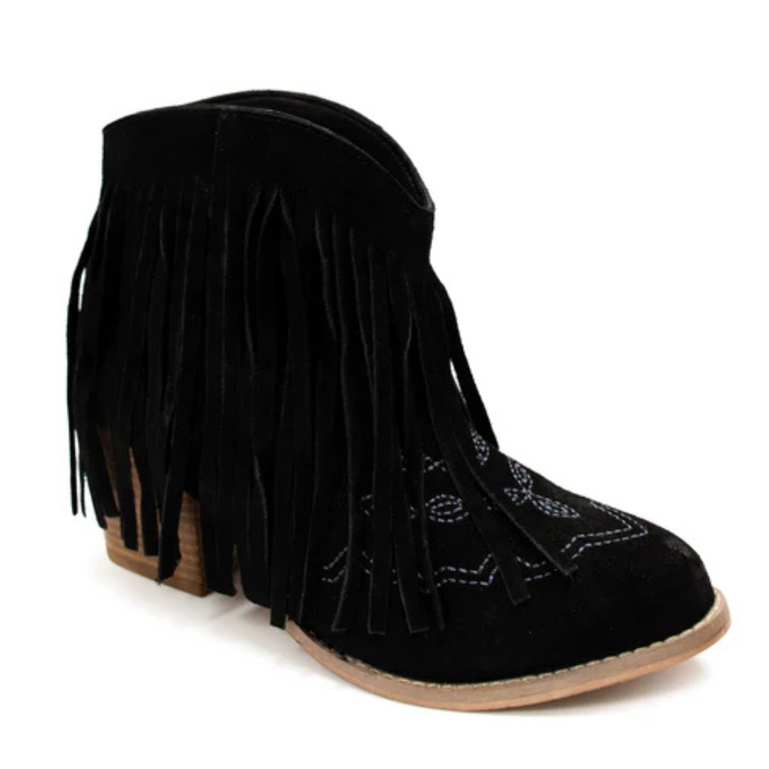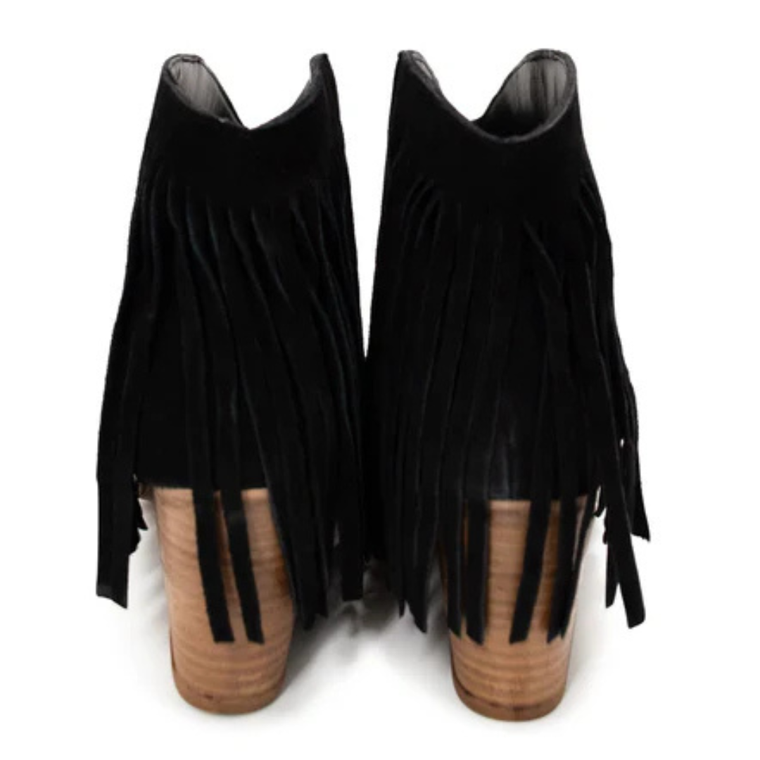 Elevate your style with our Amos Fringe Ankle Bootie in Black! Made with genuine suede, they feature a beautiful western fringe and stitch detailing. With a comfortable 2.7 inch heel and 5.5 inch shaft height, they are the perfect staple piece. Fits true to size. Don't miss out!