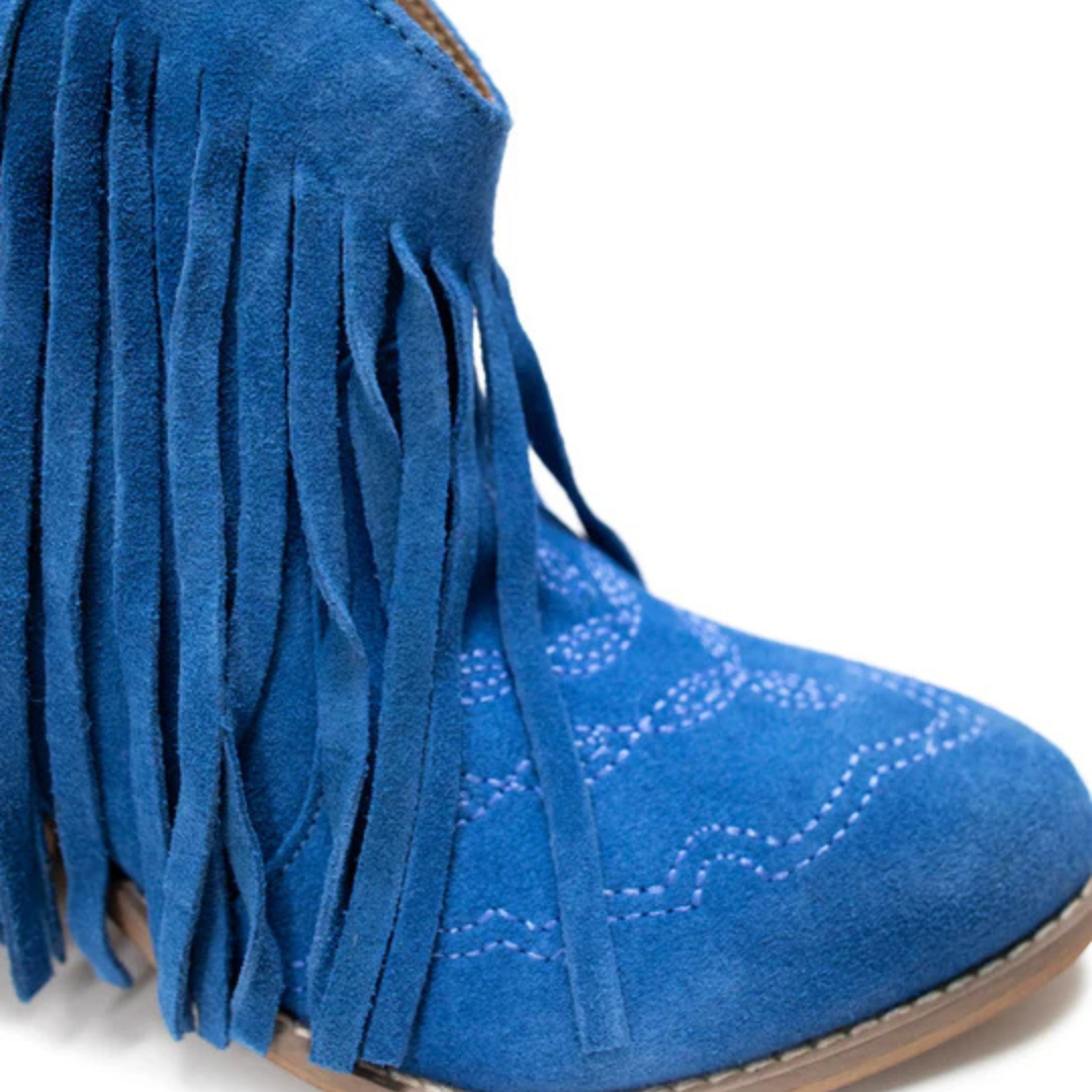 Elevate your style with our Amos Fringe Ankle Bootie in Blue! Made with genuine suede, they feature a beautiful western fringe and stitch detailing. With a comfortable 2.7 inch heel and 5.5 inch shaft height, they are the perfect staple piece. Fits true to size. Don't miss out!