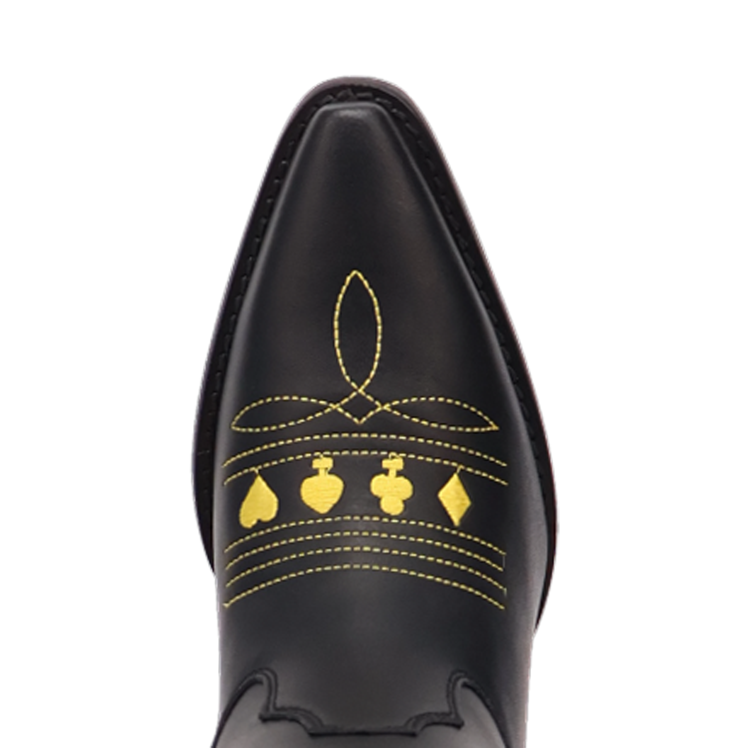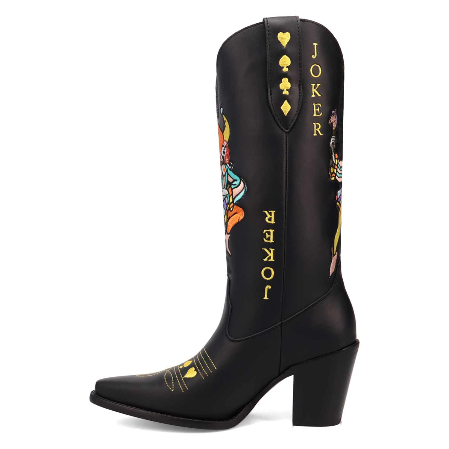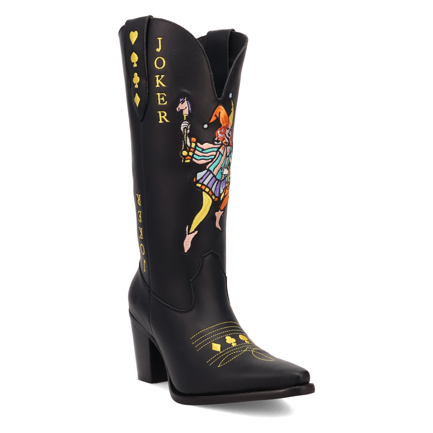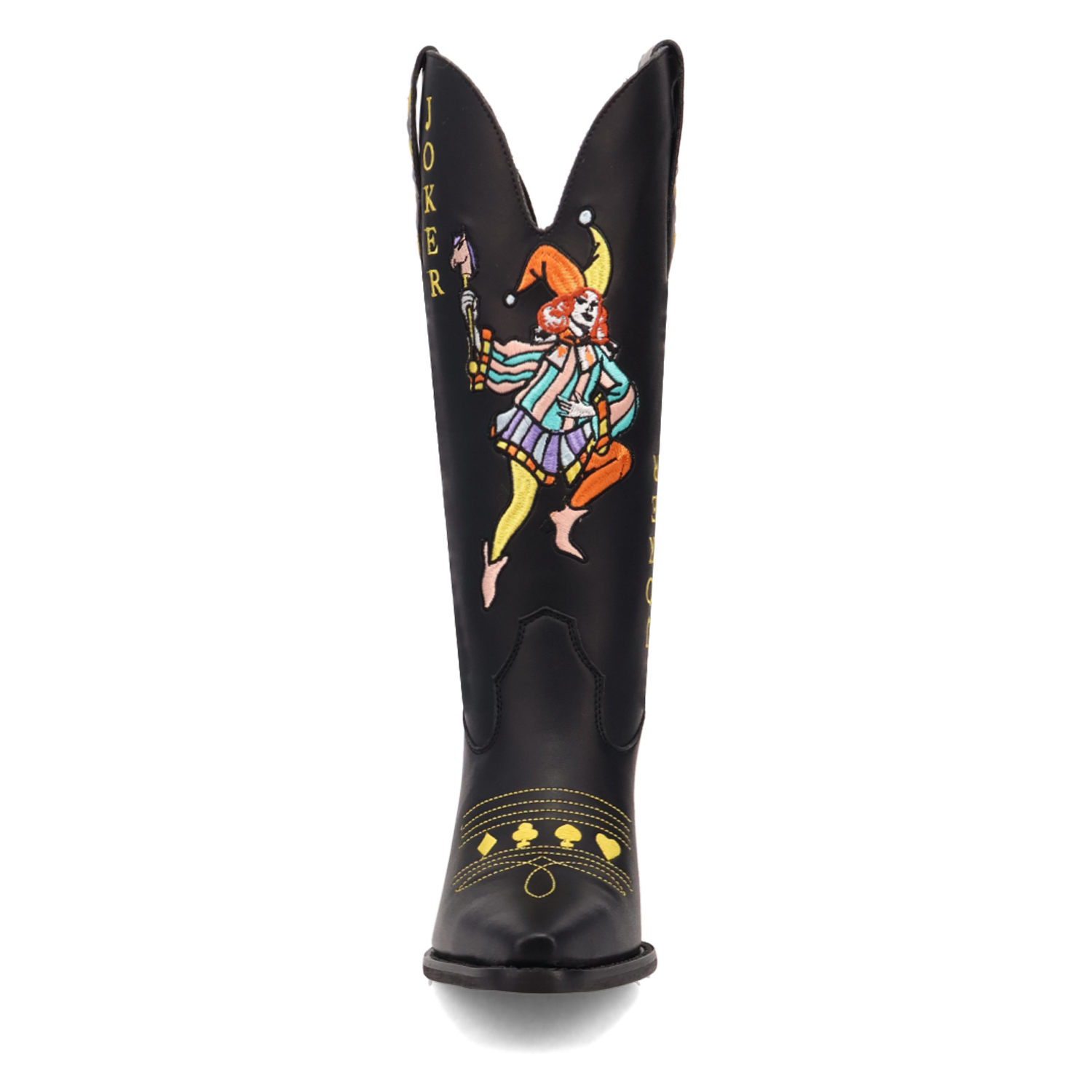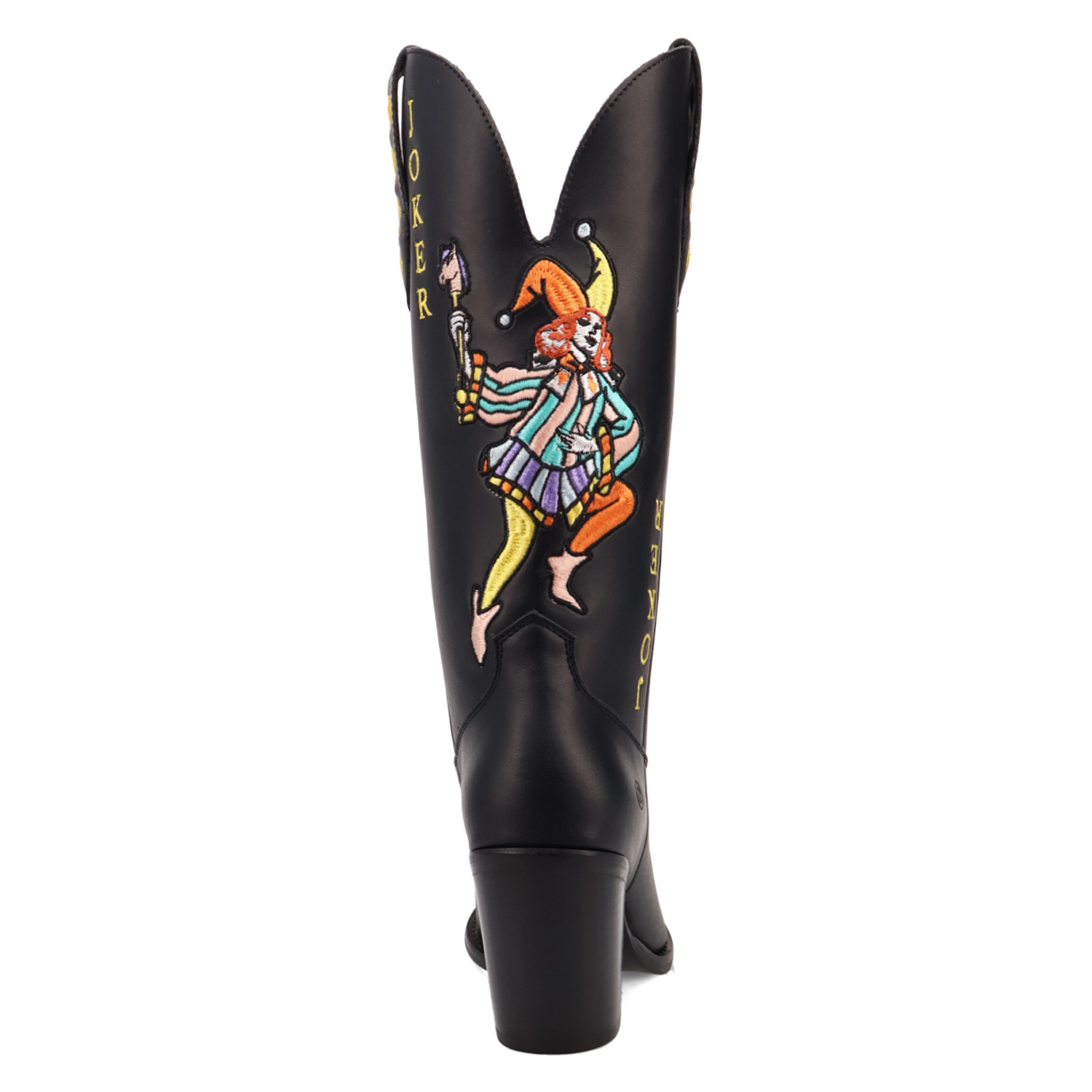 Wild card energy in every step—the Joker Leather Boot is made for the bold. With a tall shaft and classic snip toe, this standout boot features a detailed Joker graphic and all four card suits embroidered throughout. Contrast stitching adds character, giving this Western-inspired boot a playful twist with major attitude. Whether you're dressing it up or down, this one-of-a-kind boot guarantees you'll never blend in—and always keep them guessing.