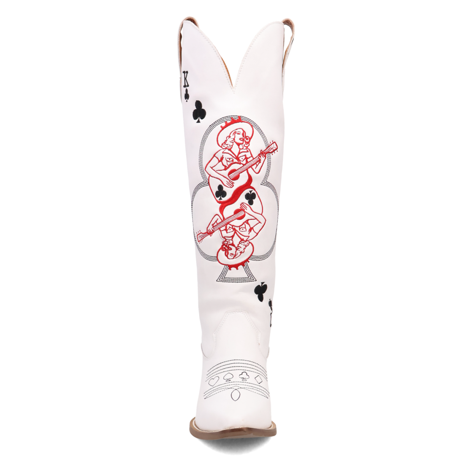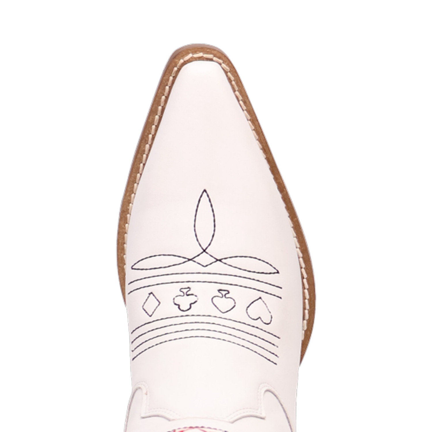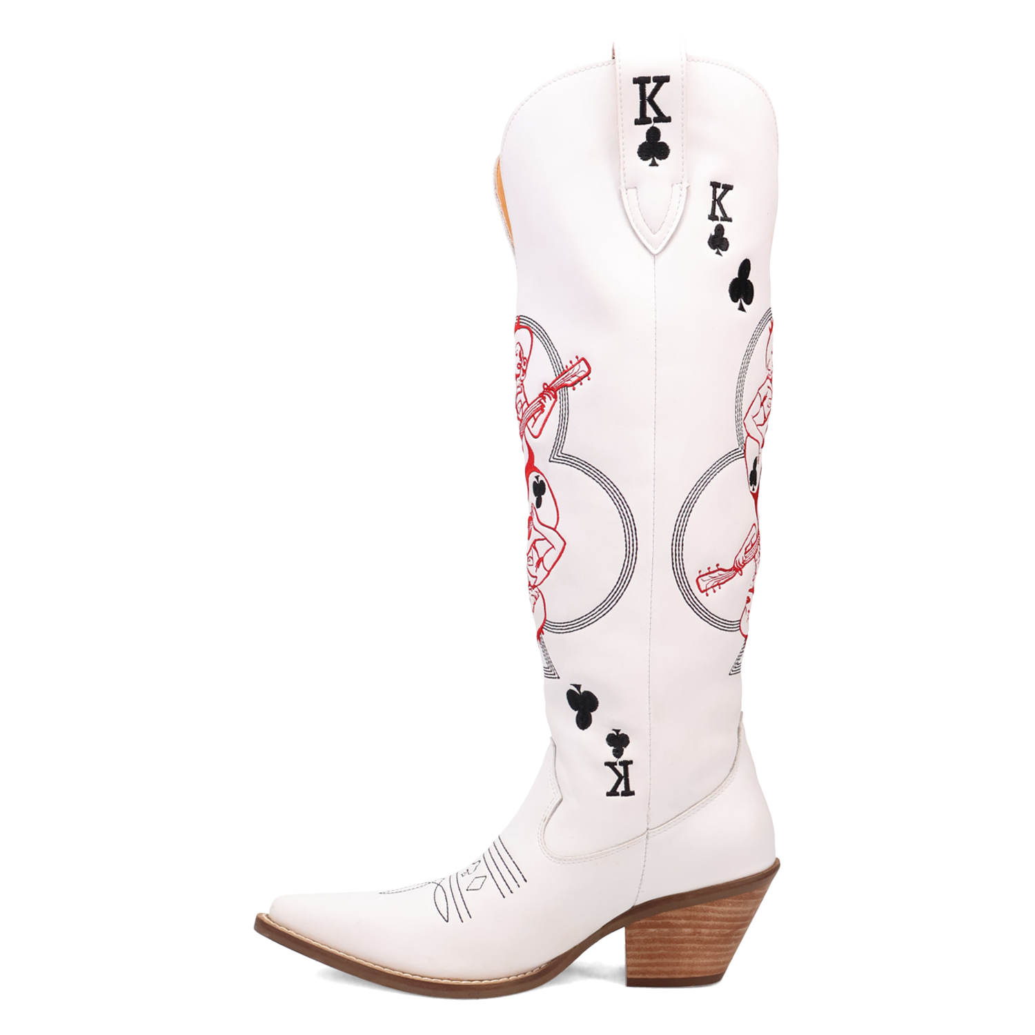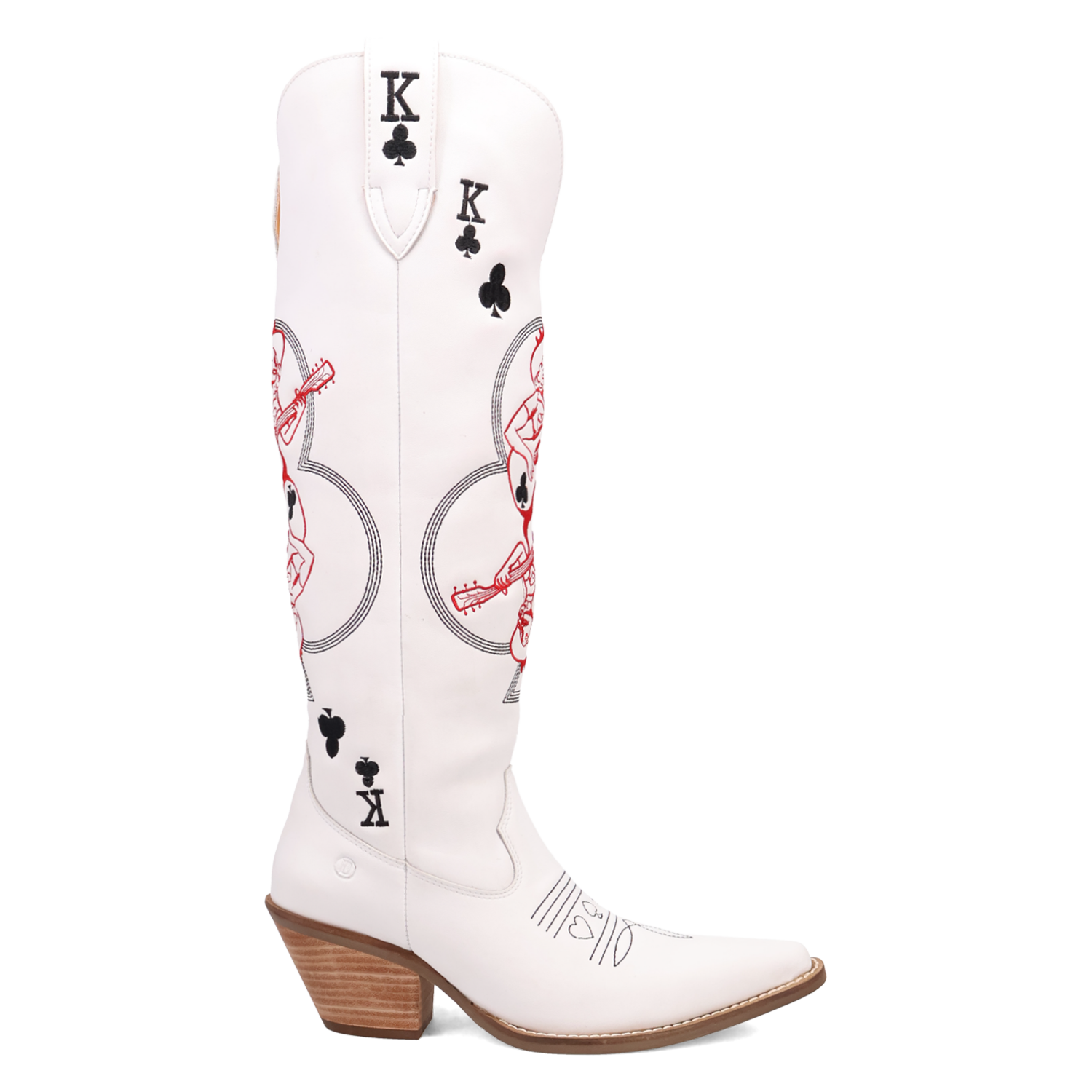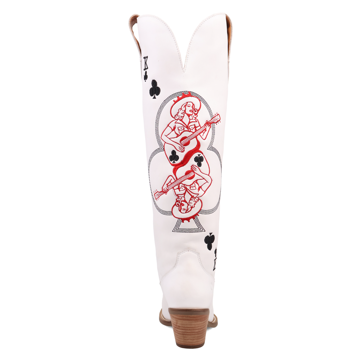 Royal by name, iconic by design—the King of Clubs Leather Boot isn’t just a boot, it’s a bold declaration. Crafted from White leather with a tall silhouette and a sharp snip toe, this boot commands attention from every angle. Red contrast stitching adds a striking pop, while the real showstopper is the embroidered King of Clubs playing card detail—making every step feel like a power move. Finished with a sturdy heel and a Western edge, this boot was made for the queen who always plays her cards right.