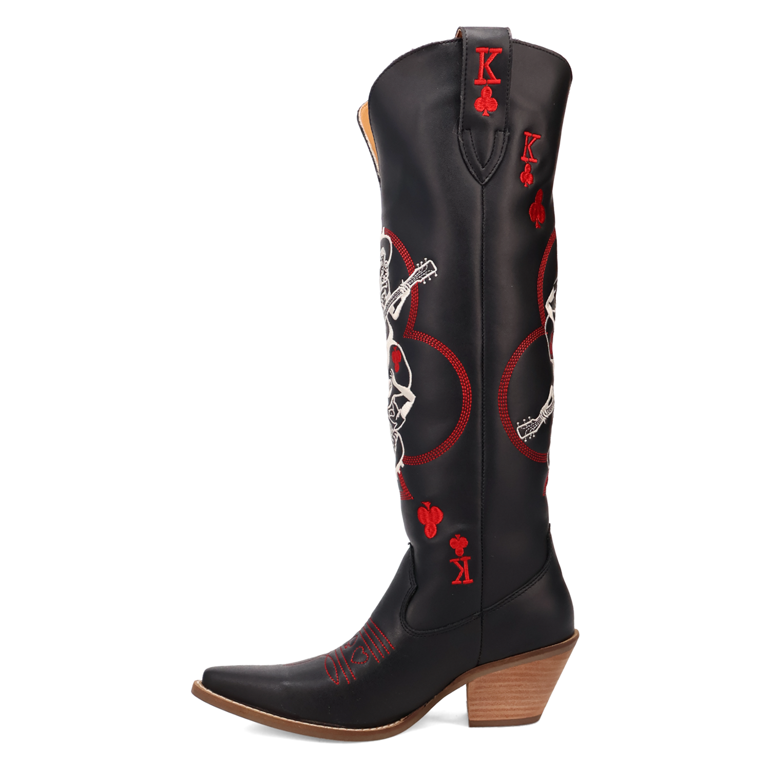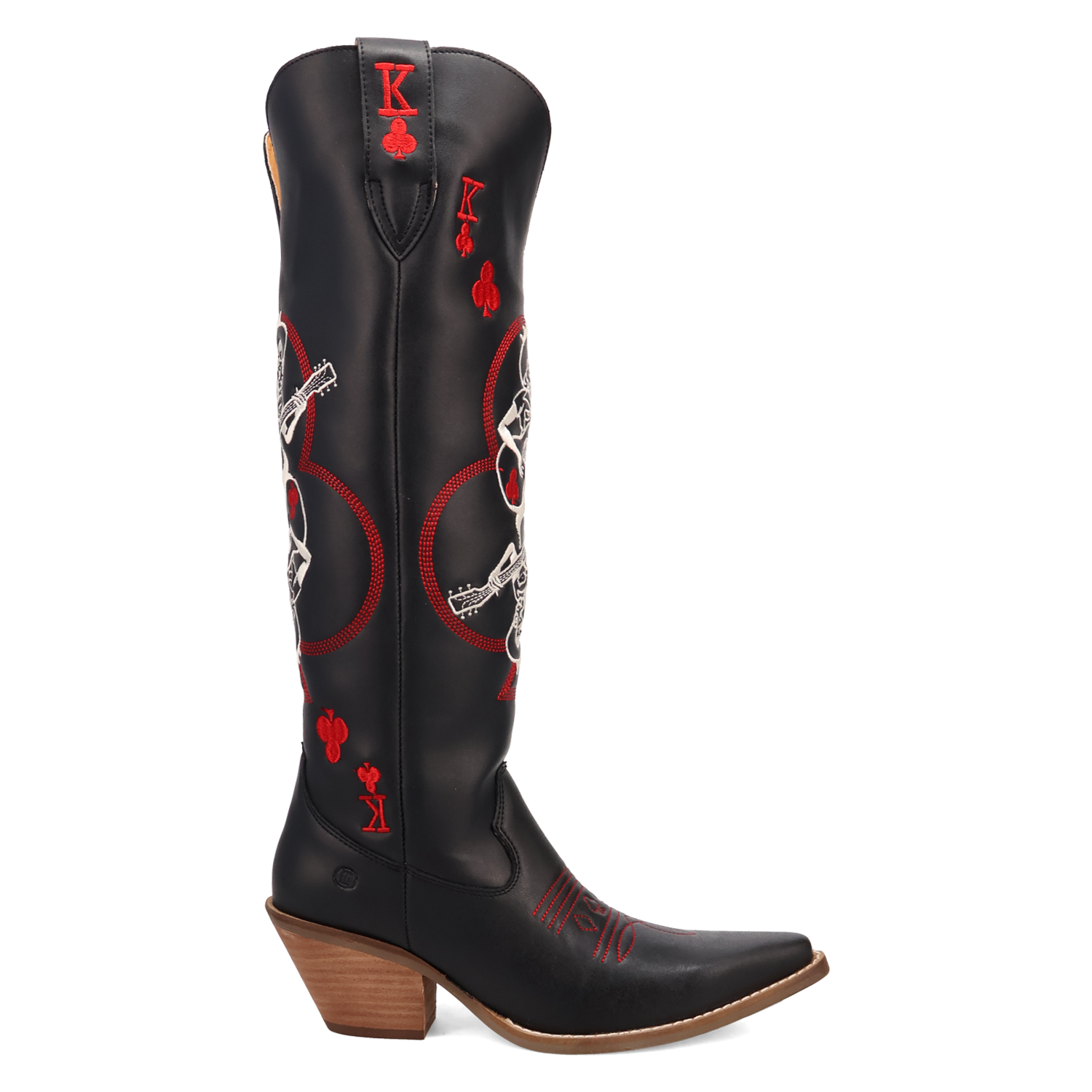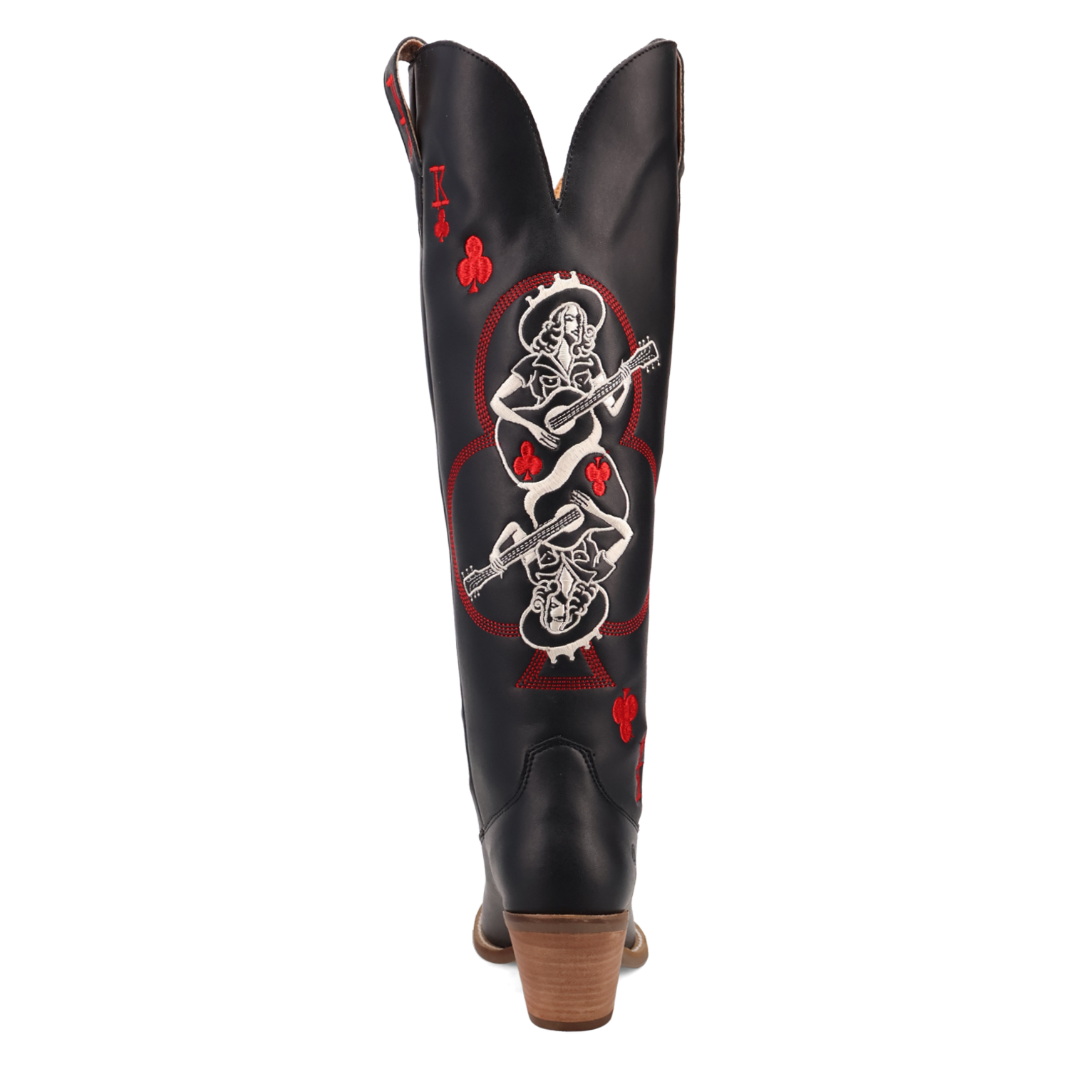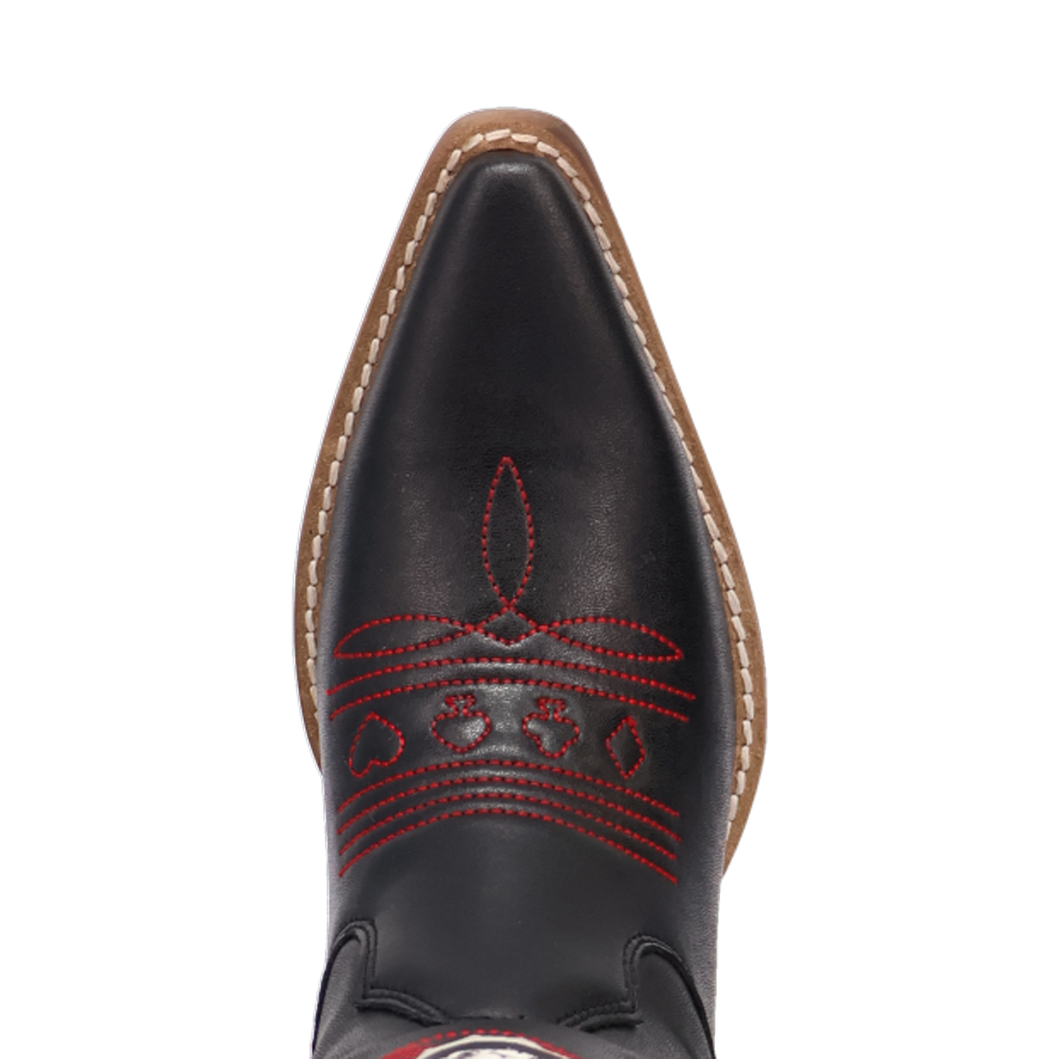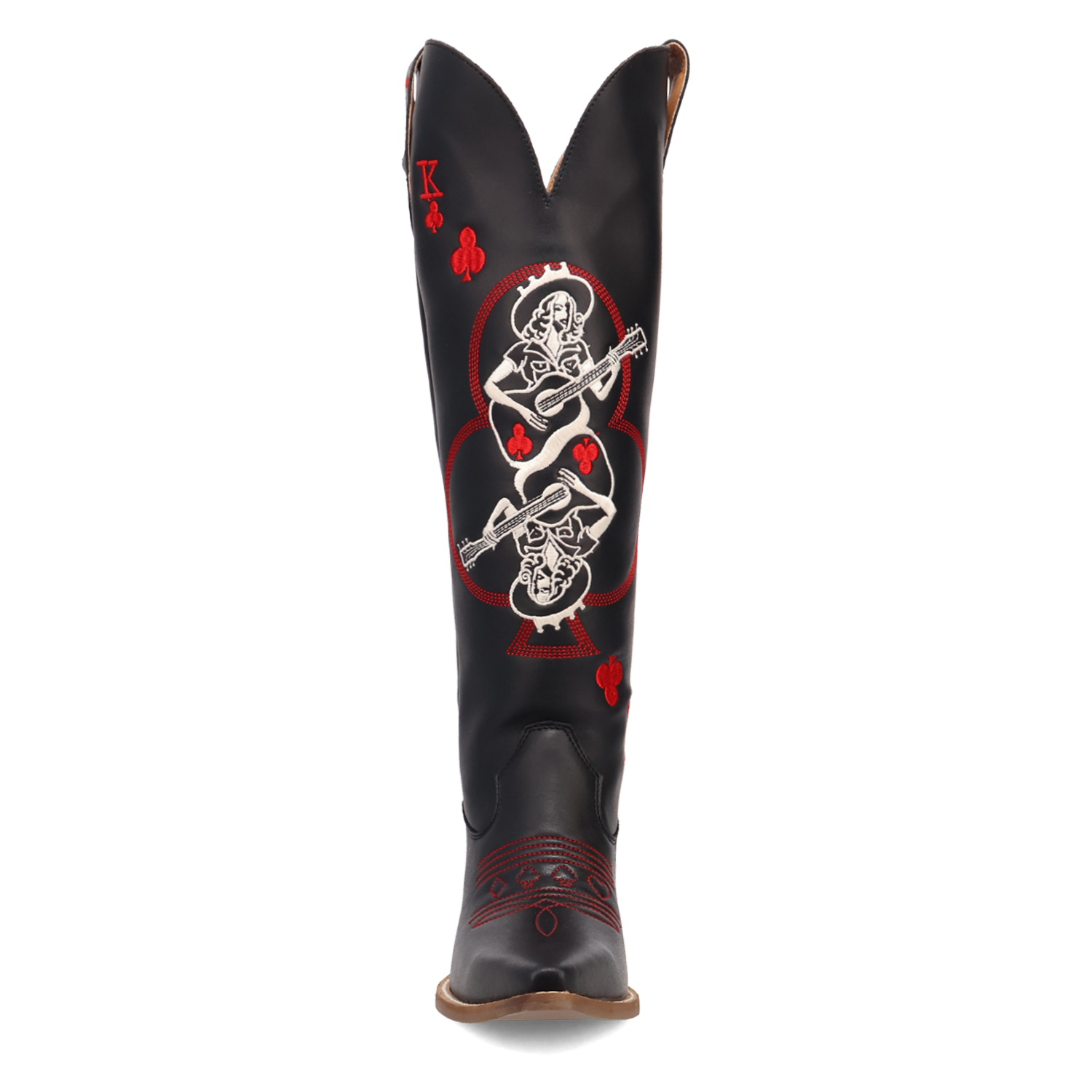 Royal by name, iconic by design—the King of Clubs Leather Boot isn’t just a boot, it’s a bold declaration. Crafted from rich black leather with a tall silhouette and a sharp snip toe, this boot commands attention from every angle. Red contrast stitching adds a striking pop, while the real showstopper is the embroidered King of Clubs playing card detail—making every step feel like a power move. Finished with a sturdy heel and a Western edge, this boot was made for the queen who always plays her cards right.