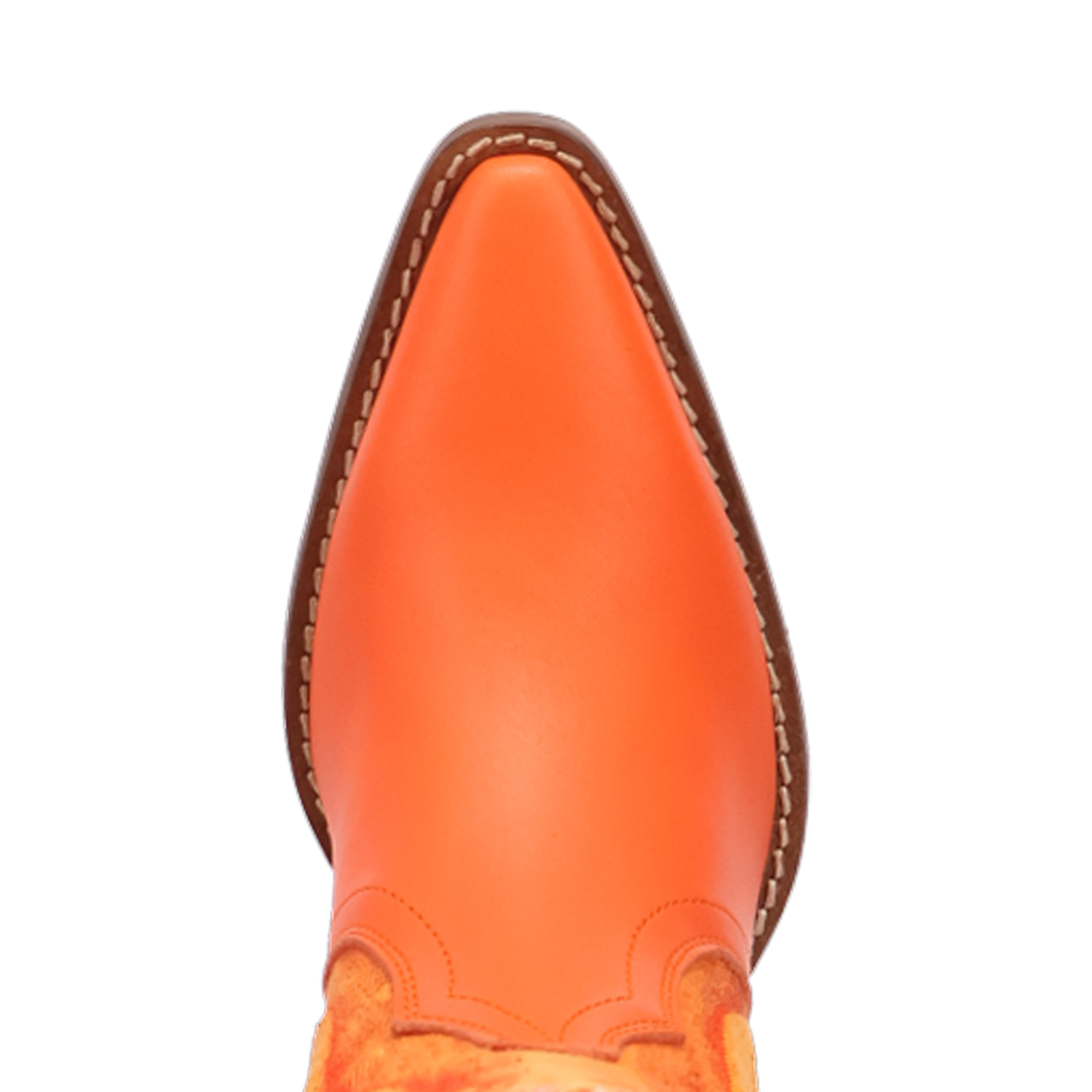 Step out in style with these orange leather boots featuring a 10" shaft and a 12" circumference for a perfect fit. Enjoy the cushioned comfort insole and a sleek J-pointed toe, all balanced on a 3 1/2" heel. The durable rubber outsole keeps you steady while turning heads.
