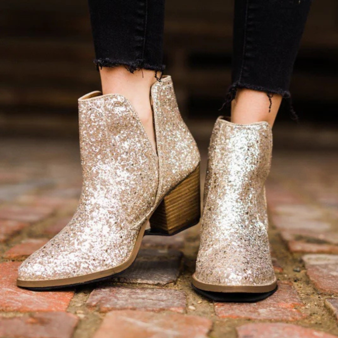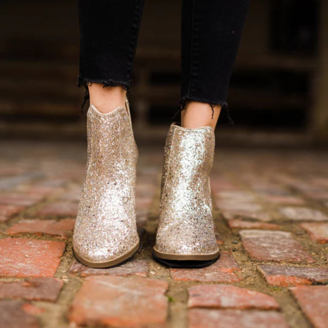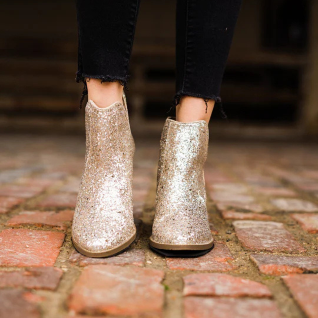 Add a touch of sparkle to your outfits with our Fiera Booties in Gold! These stunning booties feature a glittery gold design and a comfortable 3-inch heel, making them the perfect choice for any special occasion. Elevate your style and make a statement with these limited booties.