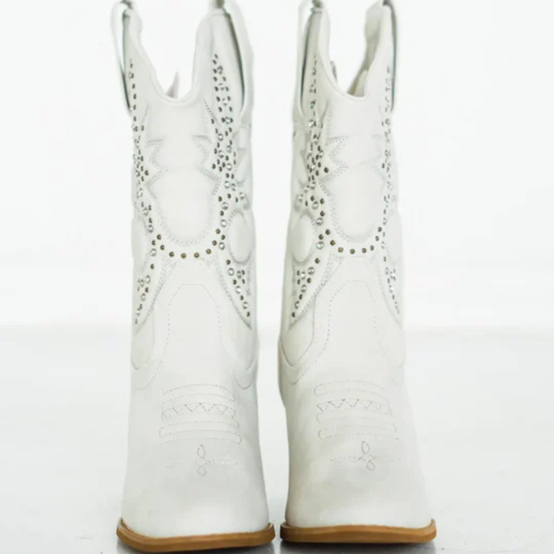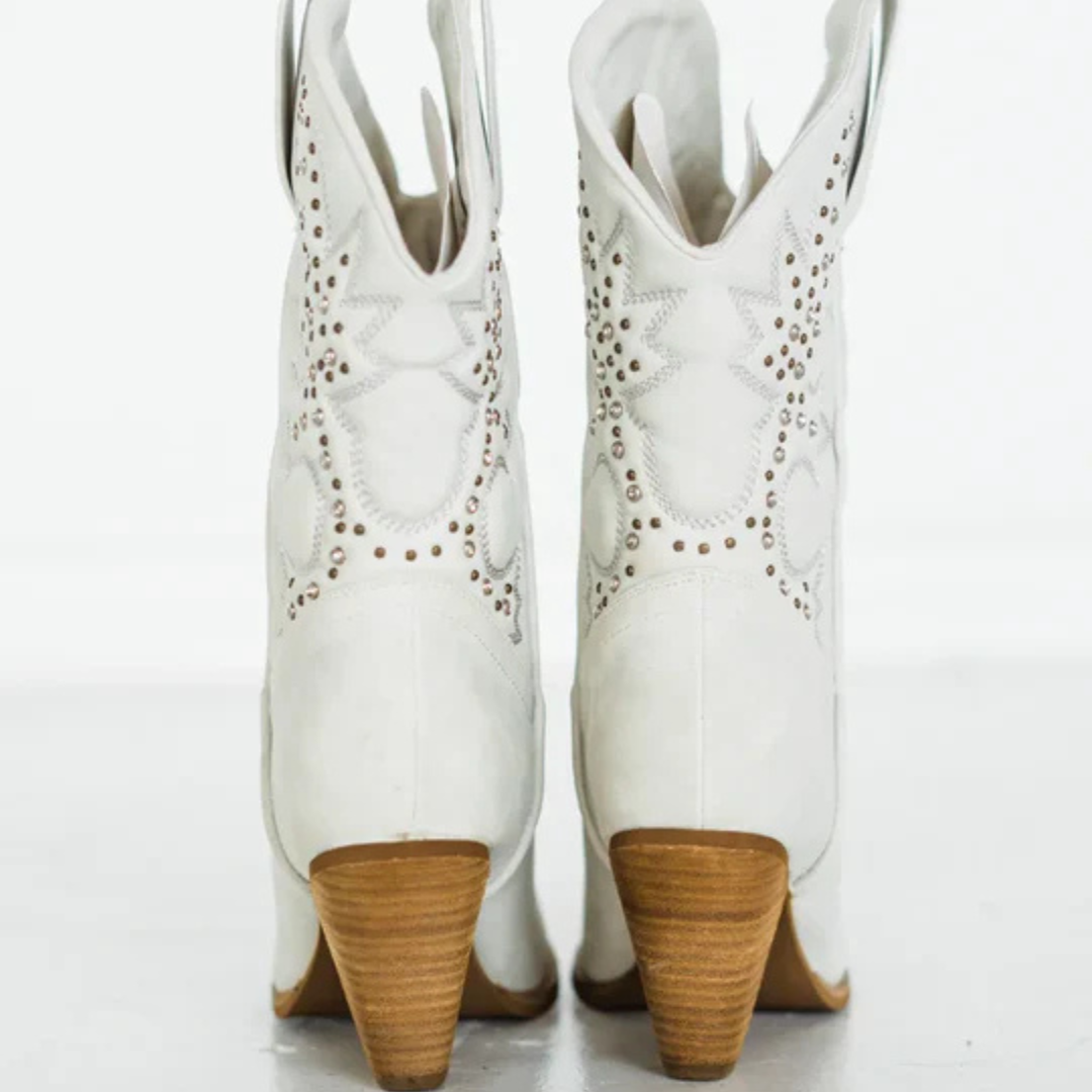 Elevate your style with these chic Western-inspired boots! Crafted with a faux leather upper in a crisp white hue and adorned with bronze studs, these boots are sure to turn heads. The almond toe and 3 inch heel height add a touch of sophistication. These boots fit true to size, but if you are between sizes, we recommend sizing up for the perfect fit. Order now and step into style!