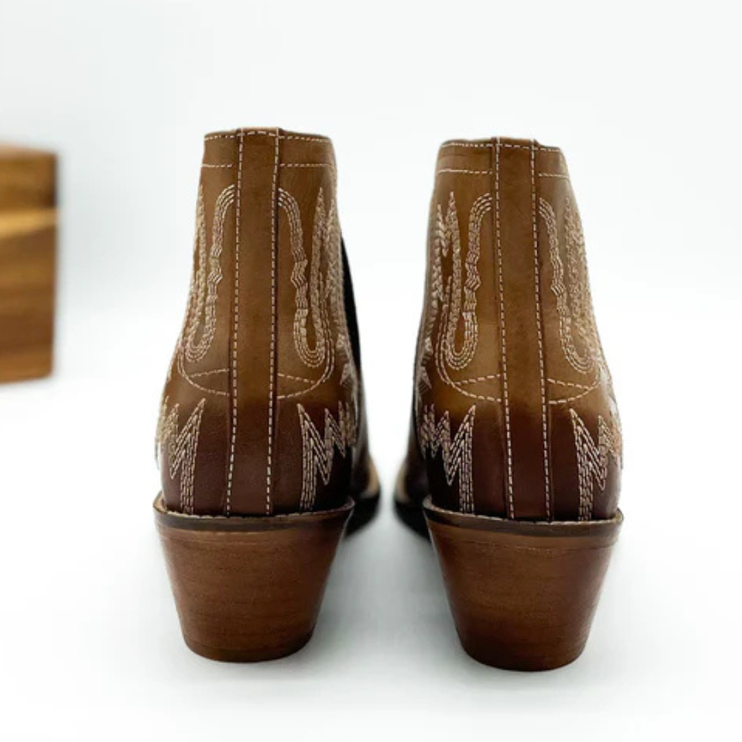 Step up your fashion game with our Kickin' Western embroidered Booties in Tan! Featuring intricate western-style embroidery and a comfortable 2.25-inch heel, these genuine leather booties add a stylish edge to any outfit. The cushioned footbed and ankle slits ensure both comfort and a charming look. Available in limited quantities—grab yours before they're gone!