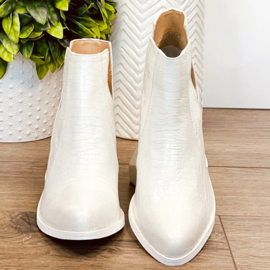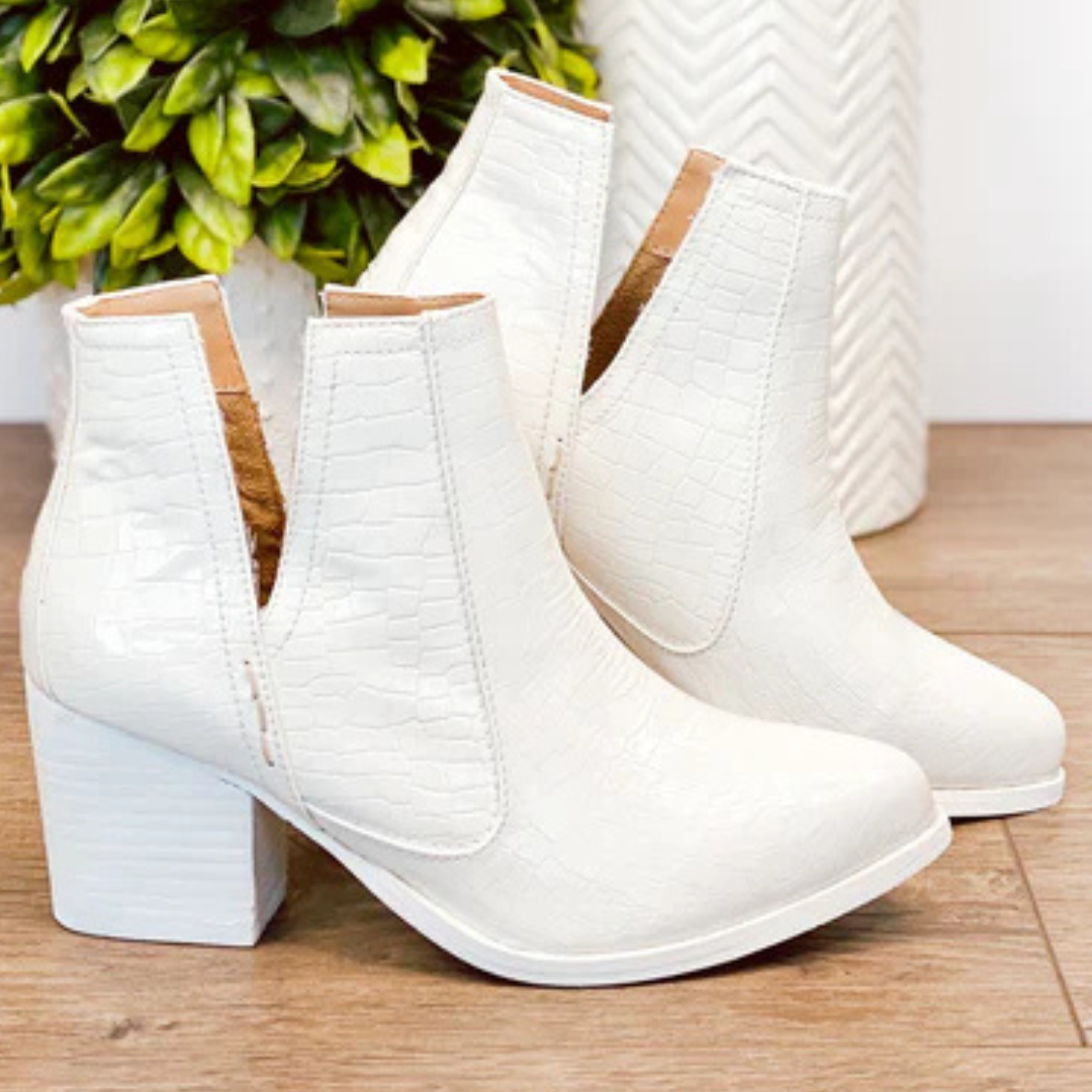 Elevate your style with our Tarim bootie, a timeless favorite for any occasion! The faux white croc upper and matching white sole exude versatility, while the 2.75 inch heel and cushioned footbed add the perfect touch for a comfortable and chic look! Experience the value and appeal of these booties today.