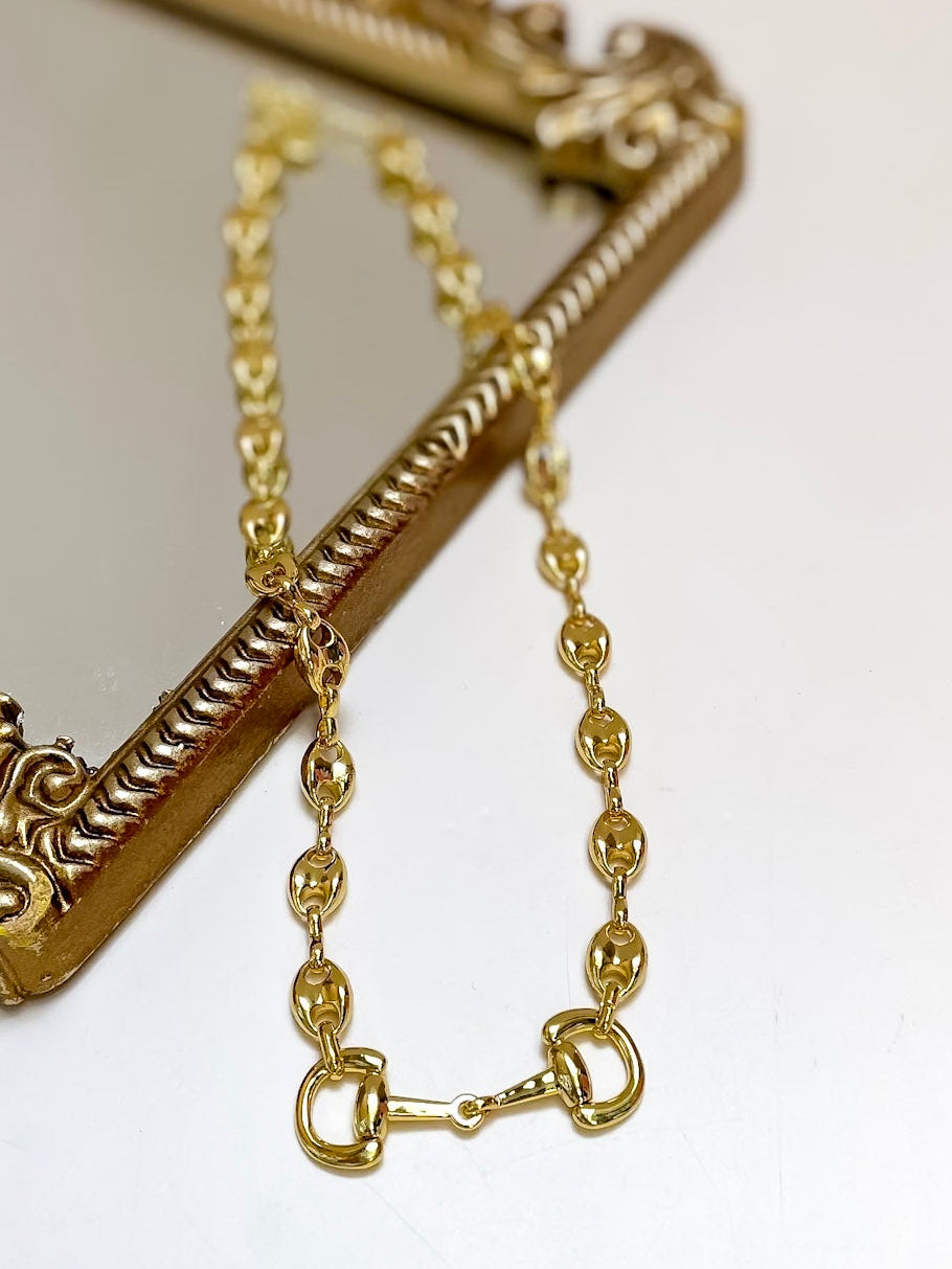 Elevate your everyday look with the Saddle Luxe Horse Bit Necklace, a bold and beautifully polished piece that blends modern glam with classic horse-bit detailing. The sculpted gold-tone links create a luxe, high-shine finish, while the front bit-style clasp adds a chic touch that feels both timeless and trend-forward.
