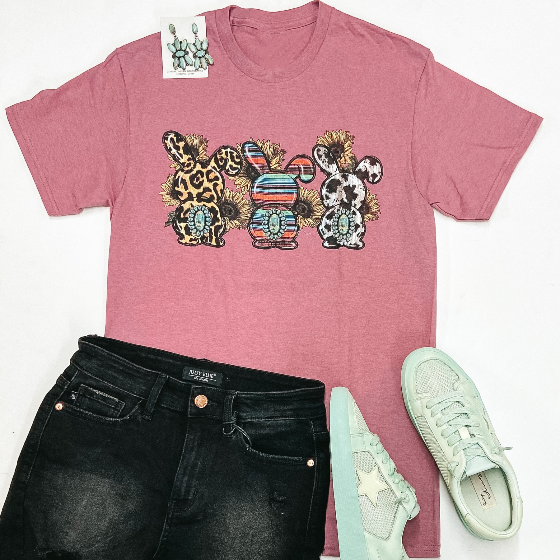 This adorable graphic tee is perfect for Easter! It includes short sleeves, a crew neckline, and three colorful printed bunnies with turquoise stone tails. Pair this with jeans and sneakers for a fun look!