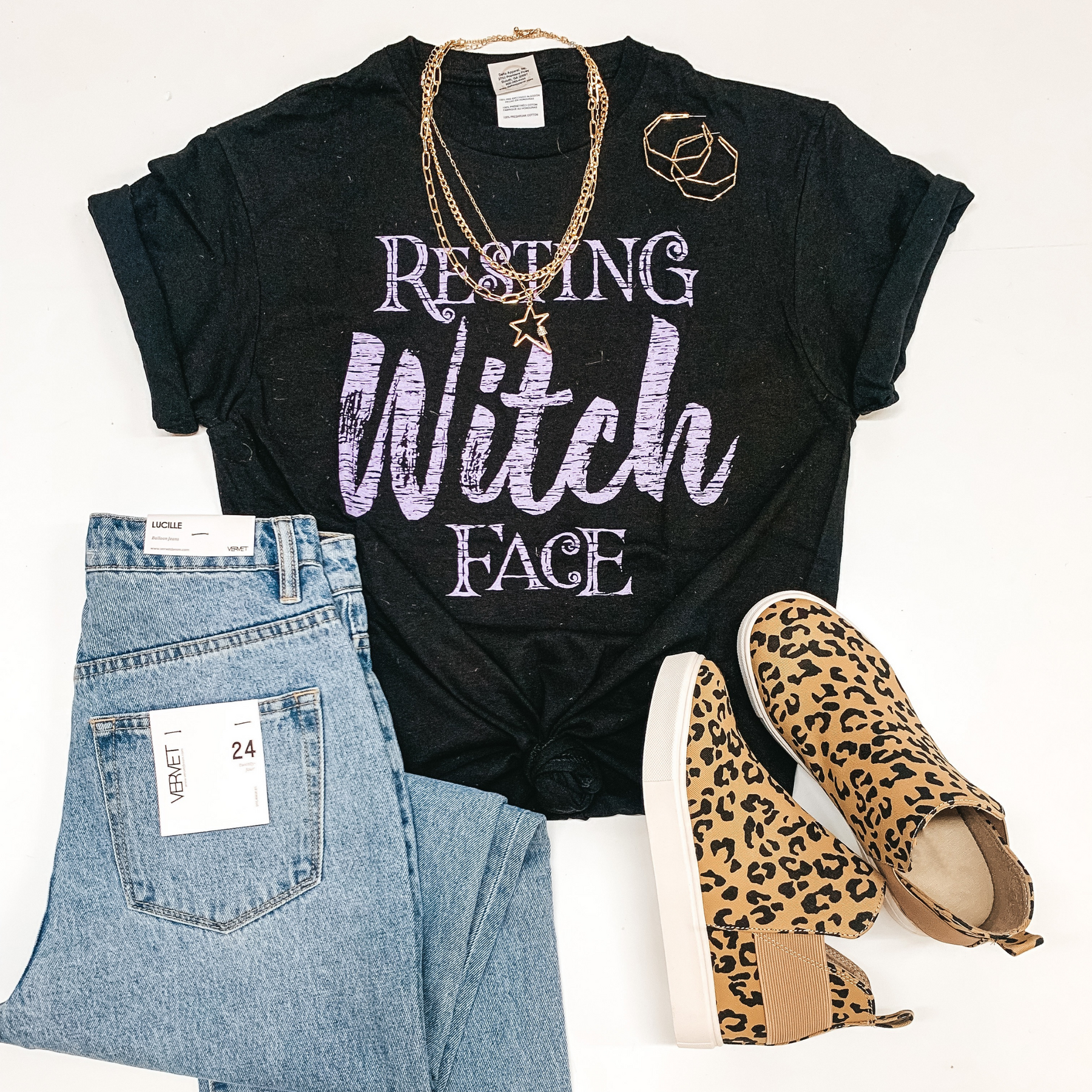 This cute graphic tee is perfect for this seasons! Throw a cardigan over it or wear it with shorts! It includes short sleeves, a crew neckline, and graphic that says "Resting Witch Face."