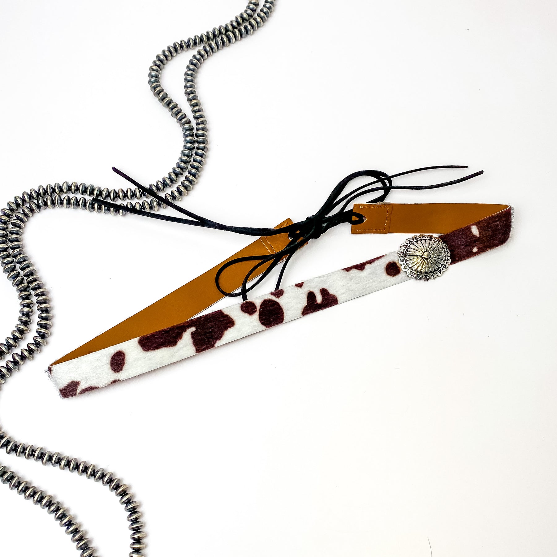 Back Road Chillin Cow Print Hat Band in Dark Brown/Silver Tone
