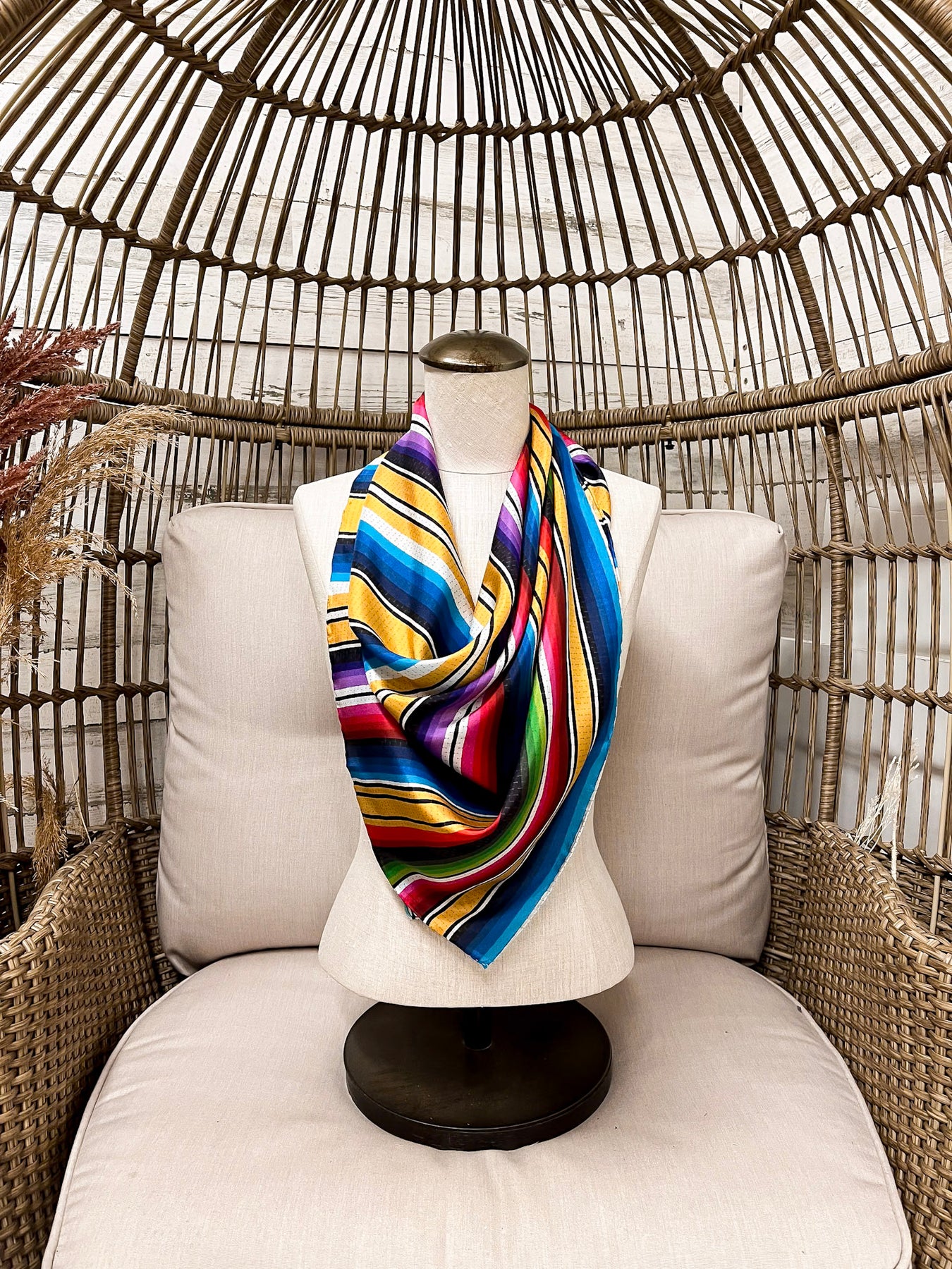 The Stripe Southwest Silk Wild Rag by Wyoming Traders offers a refined take on traditional Southwest style. Featuring bold horizontal stripes in rich gold, turquoise, red, navy, and purple, this design delivers vibrant color while maintaining a clean, classic look.