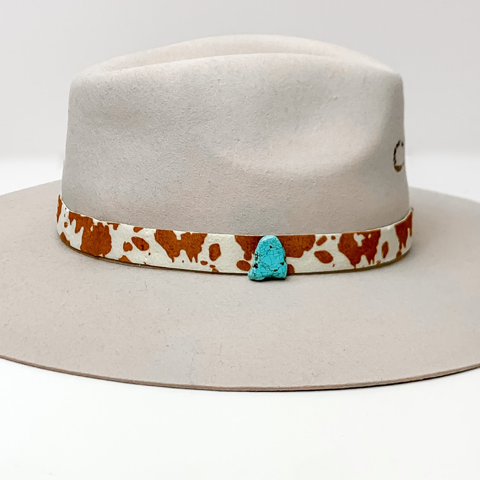 Cow Print Hat Band with Faux Turquoise Charm in Brown, and Ivory. Pictured on a white background with the band around a light tan/ brown hat.