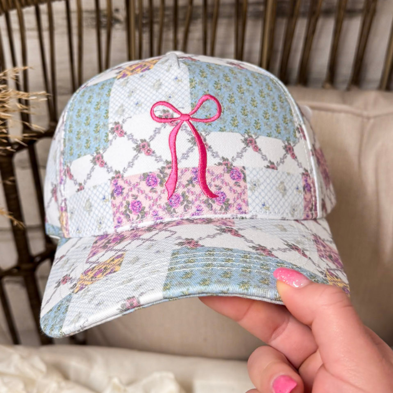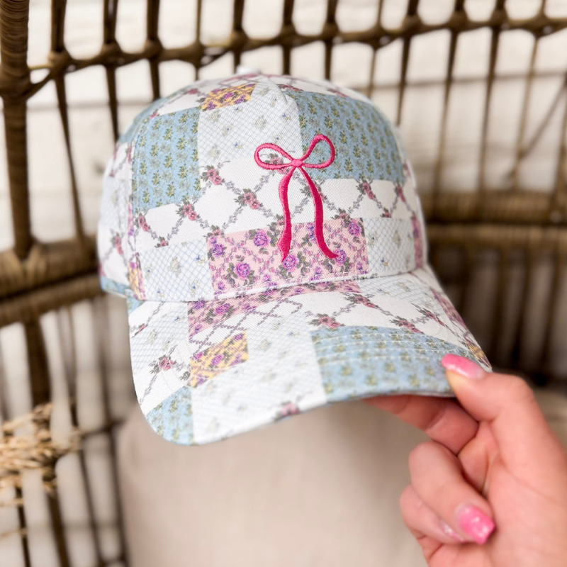 Simply Southern | Patchwork Pretty Embroidered Bow and Patchwork Print Hat in Blue