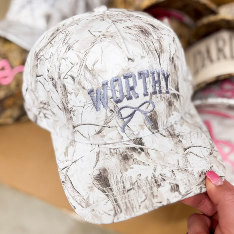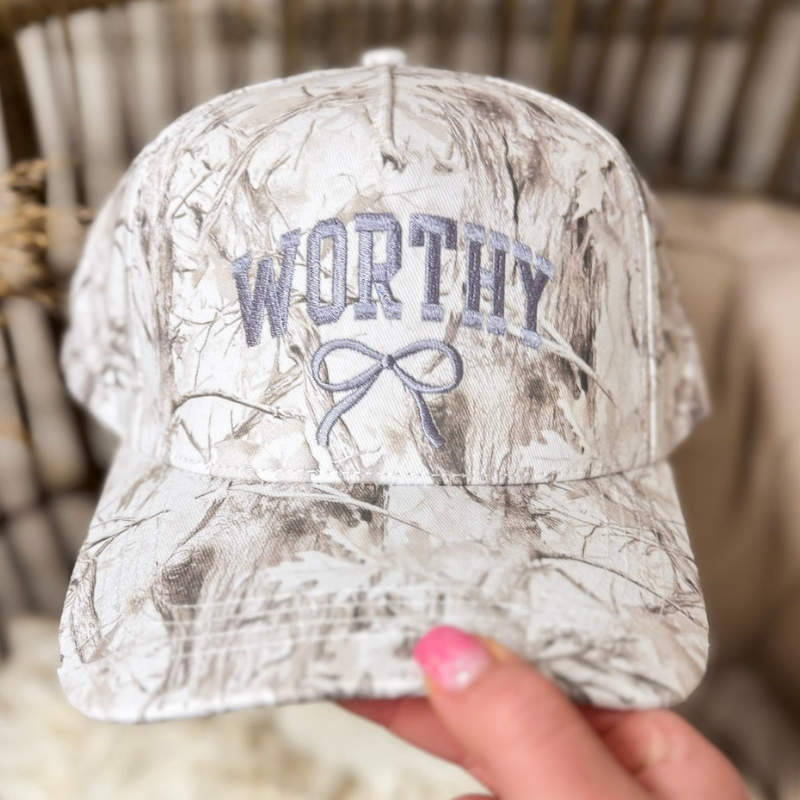 Simply Southern | Worthy Charm Embroidered Camo Hat in Grey