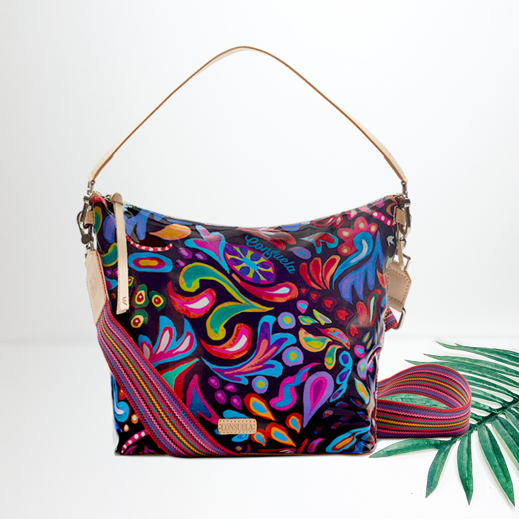 A black hobo style bag with a short leather strap and a long crossbody strap. Pictured on white background with a palm leaf.