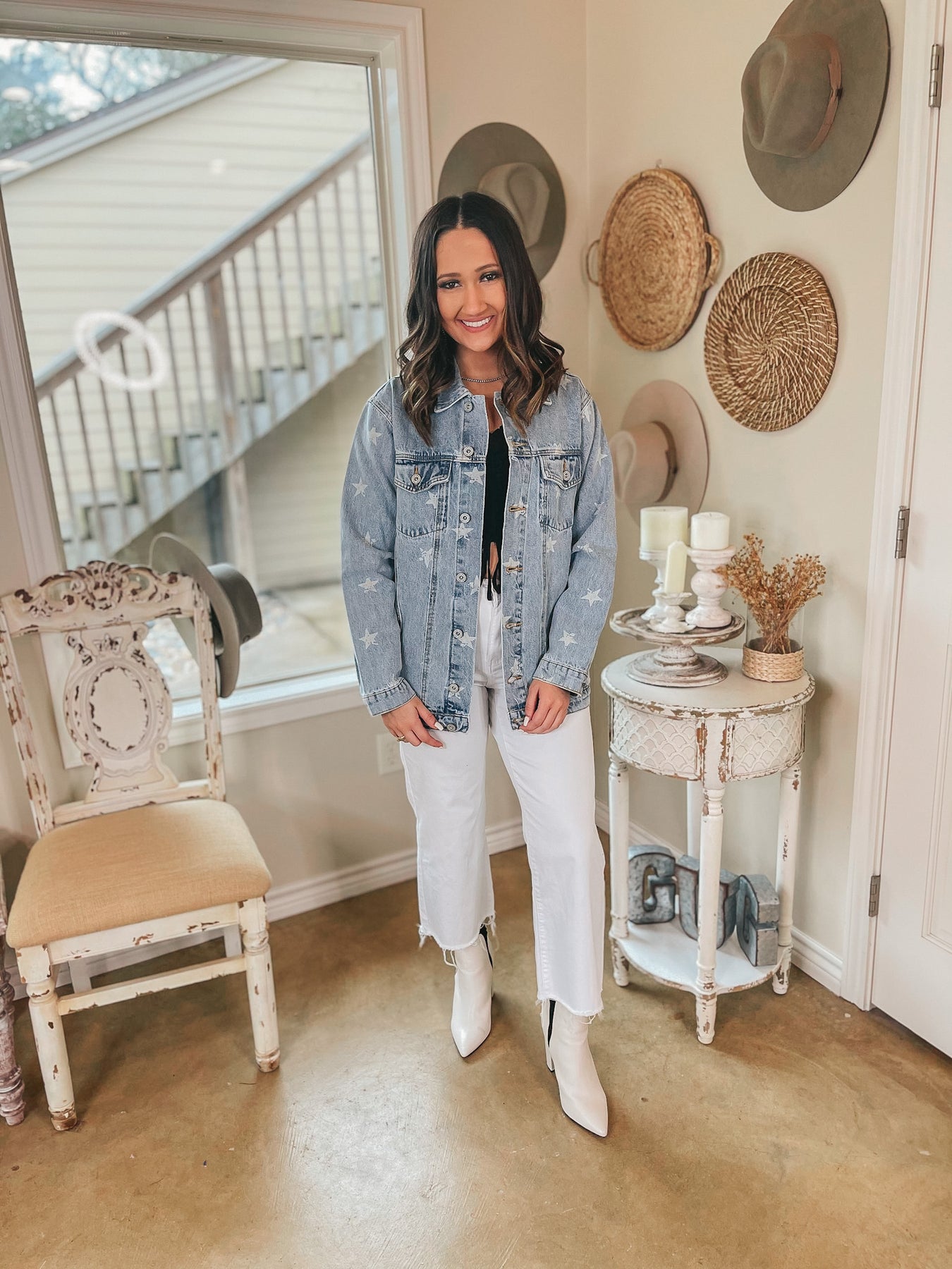Star Sign Button Up Denim Jacket with Stars in Light Wash