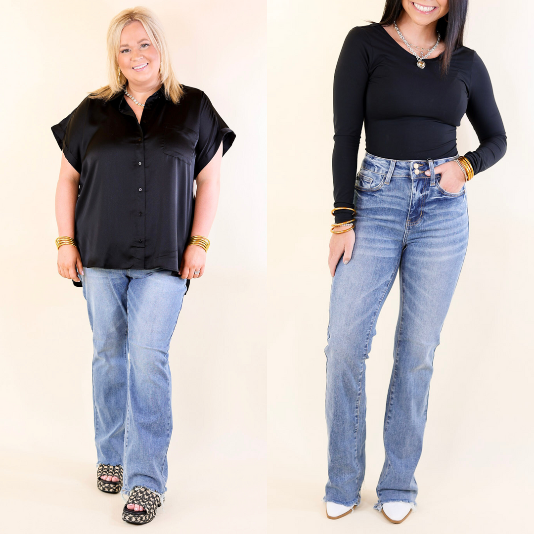 Judy Blue | Accordingly Adorable Double Button Bootcut Jeans with Raw Hem in Light Wash