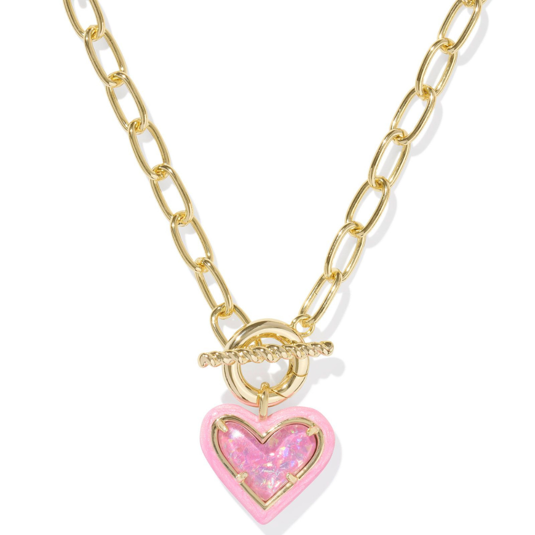 Kendra Scott | Ari Heart Gold Enamel Framed Link and Chain Necklace in Pink Iridescent Glitter Glass