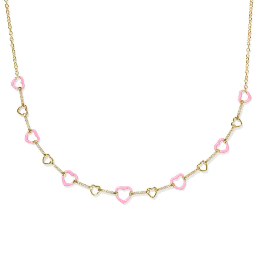 Get ready to fall for the Haisley Heart Gold Strand Necklace in Pink Pearlescent Enamel, soon to be your next go-to style. Featuring alternating open-frame hearts in metal and colorful enamel on a dainty chain, this necklace adds a touch of sweetness to your stack.