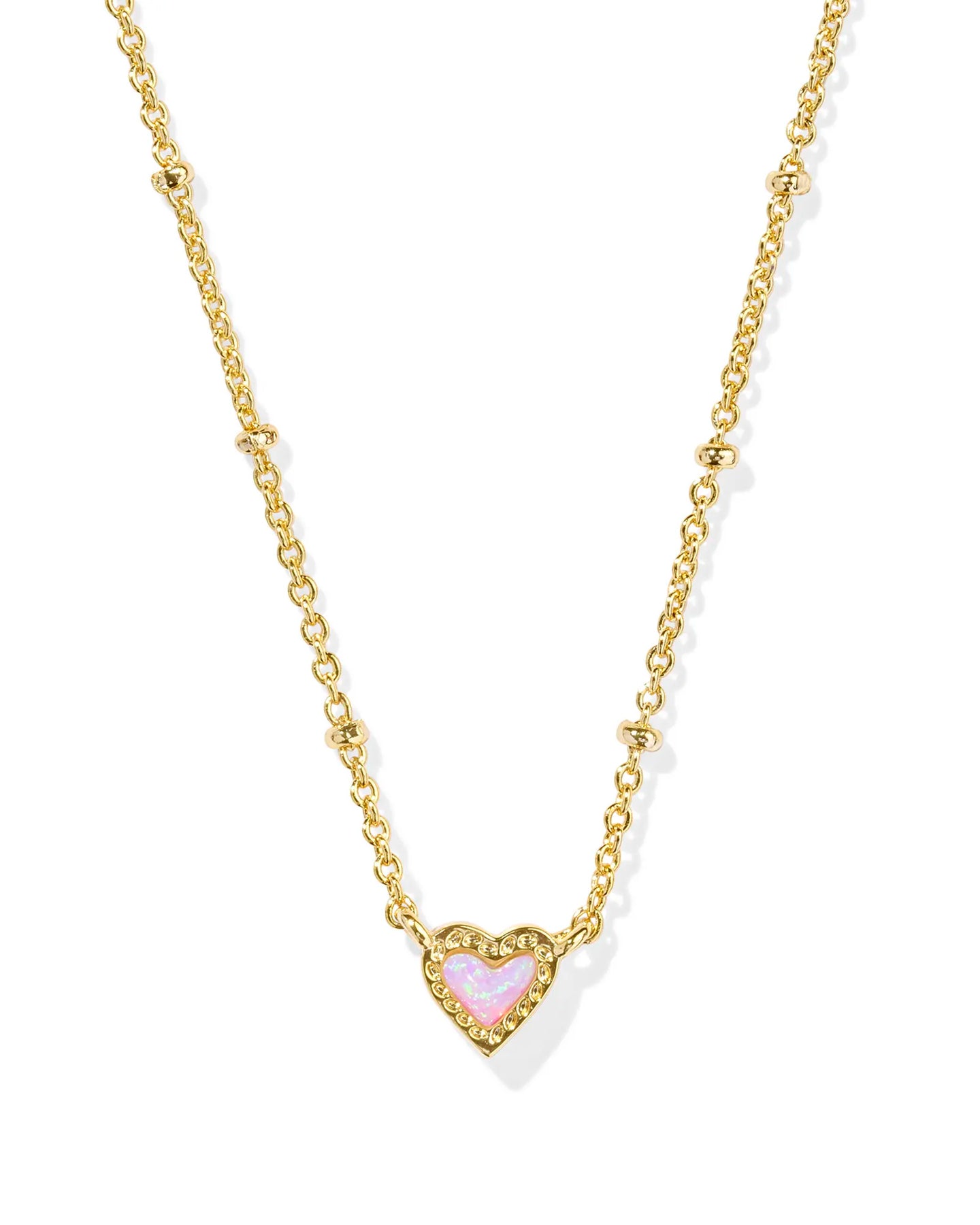 Discover elegance and style with our new Kendra Scott Mini Ari Heart Satellite Gold Necklace. Featuring a stunning Bubblegum Pink Kyocera Opal, this necklace will add a touch of charm to any outfit. Elevate your style today!