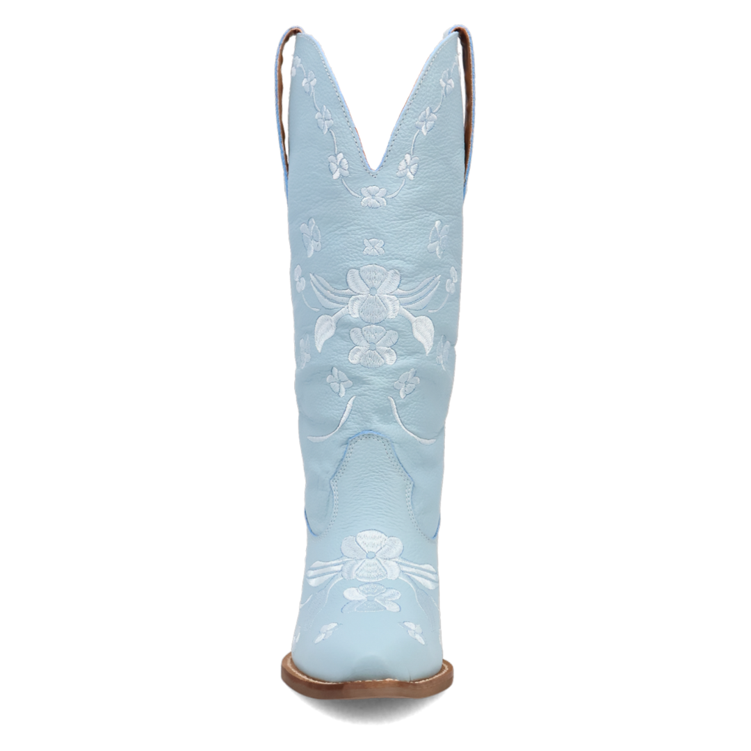 These are elegant, knee-high blue Western-style boots with intricate floral embroidery details throughout. These boots are perfect for elevating any outfit, from casual jeans to flowy dresses, with a touch of Western charm and sophistication.