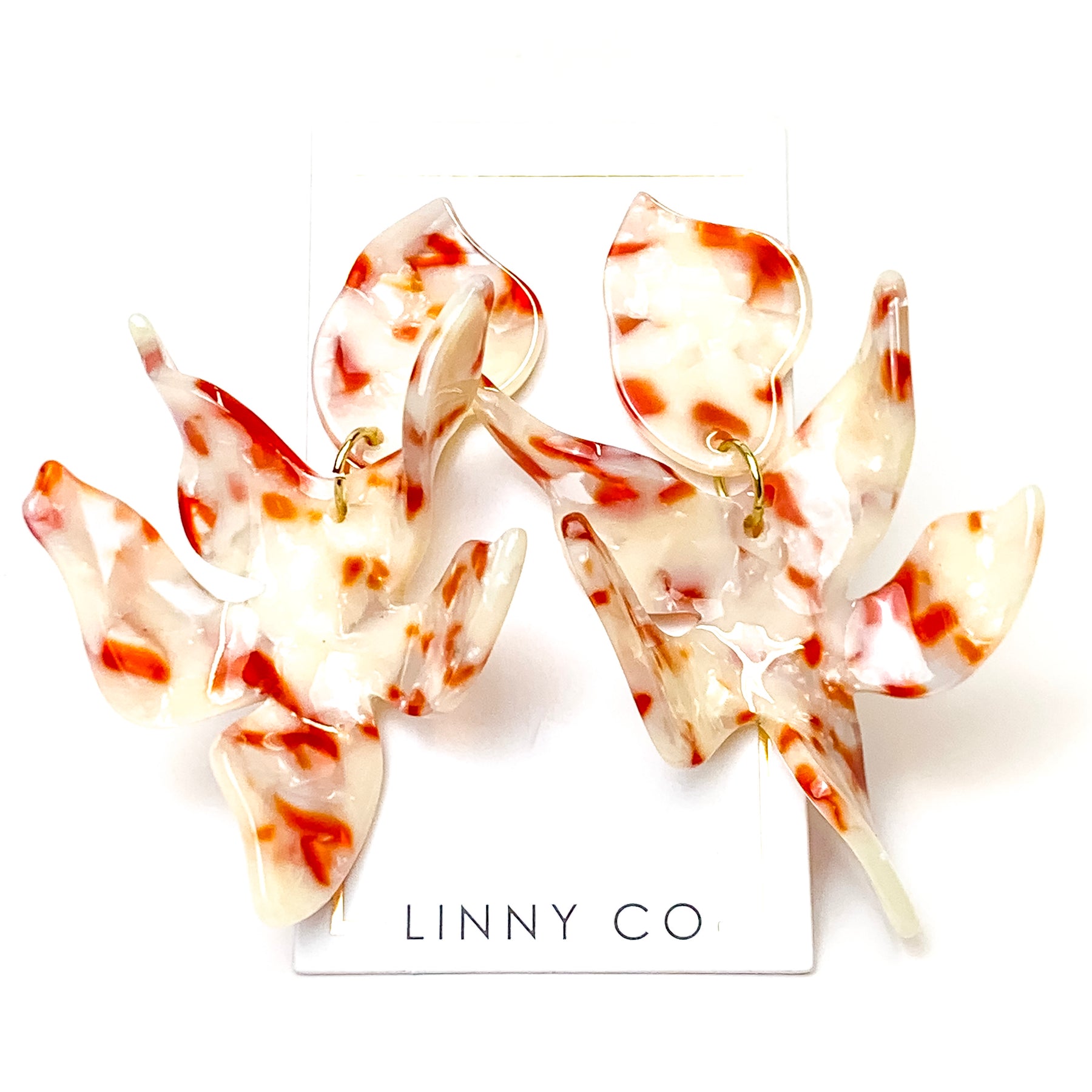Discover the elegance of Linny Co Flora Earrings, designed for both style and comfort. These oversized earrings are crafted from 100% surgical-grade stainless steel and eco-friendly acetate, ensuring they are light, durable, and safe for sensitive ears. Featuring flower-shaped accents in pearl white with burnt orange accents and a glossy finish, these statement earrings are copper and nickel-free, perfect for adding a touch of glamour to any outfit.