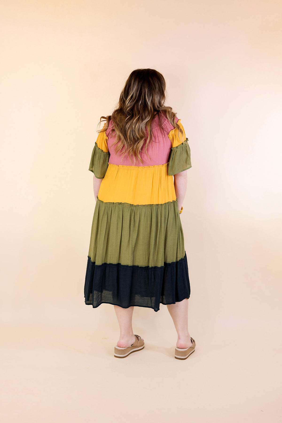 Model is wearing a color block midi dress in mustard, olive, mauve, and navy. The dress features ruffle tiers.
