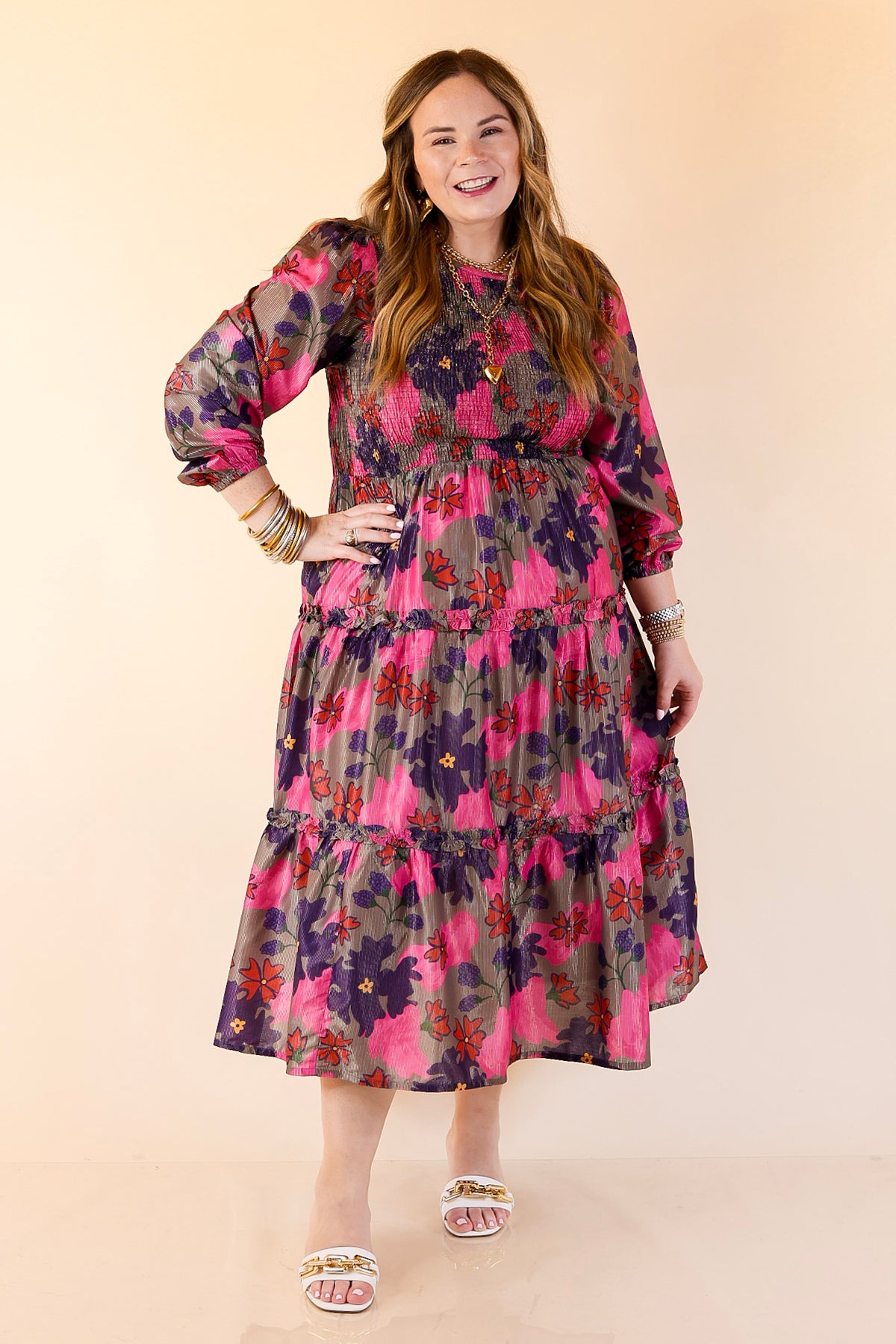 Mud Pie | Shaffer Smocked Bodice Long Sleeve Midi Dress with Tiered Skirt in Pink Mix