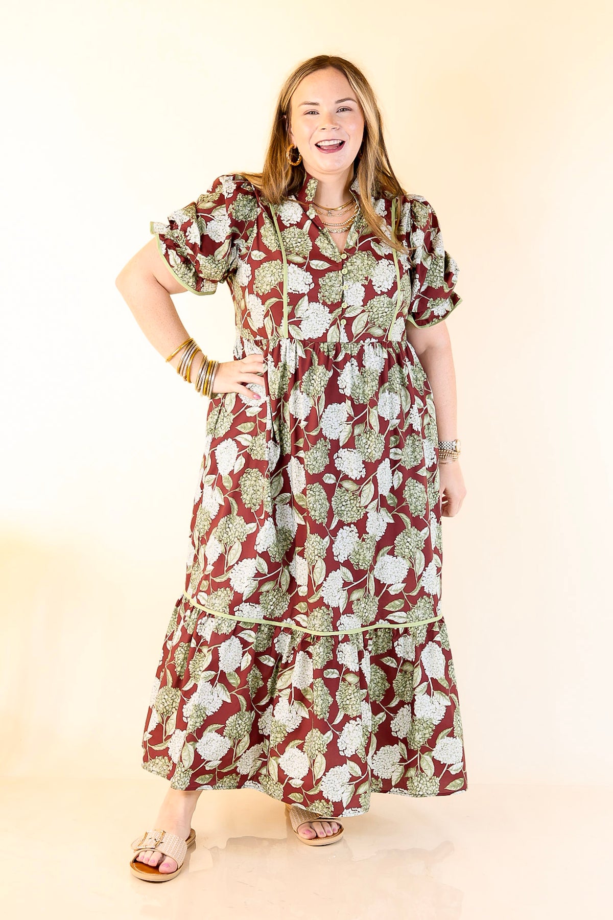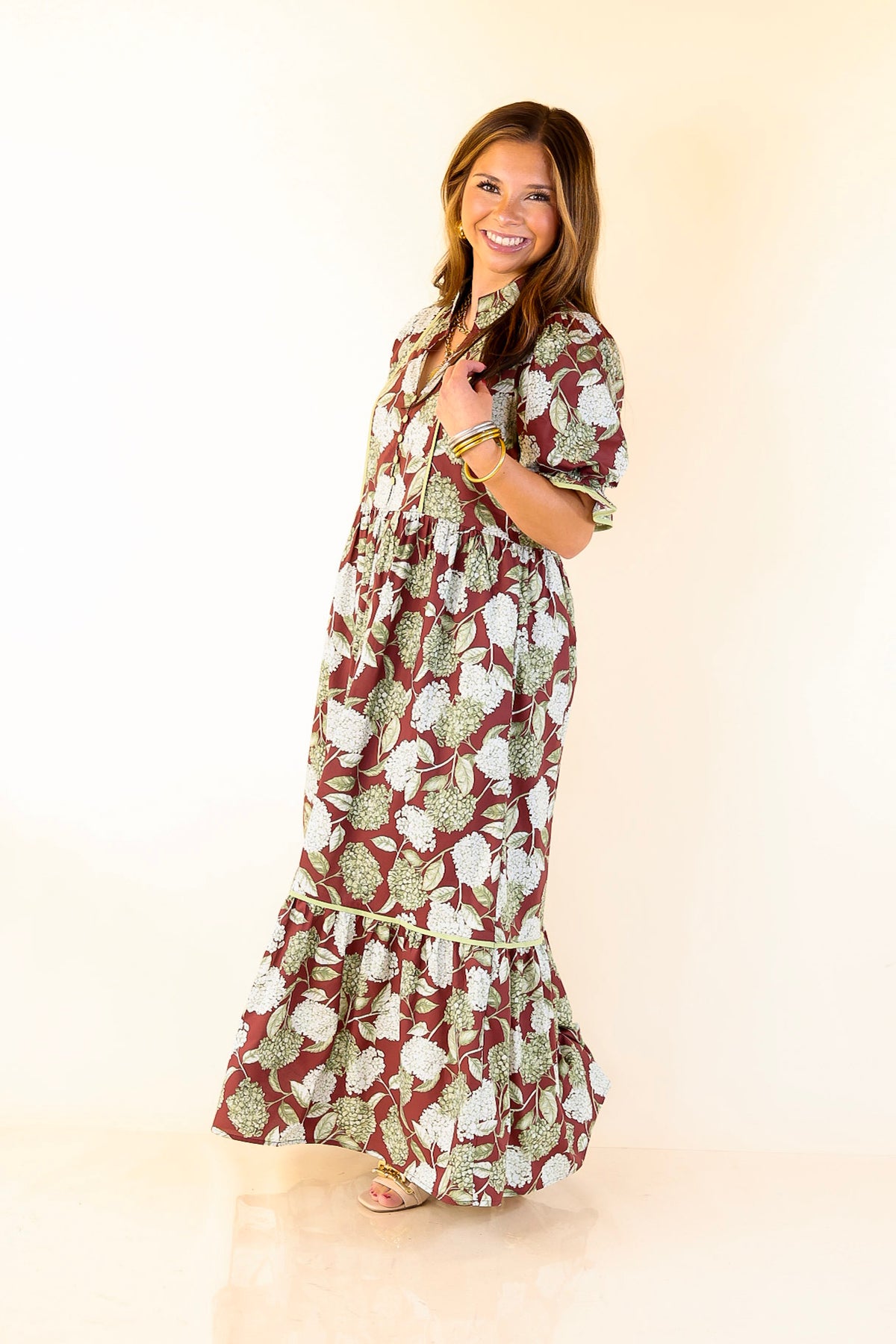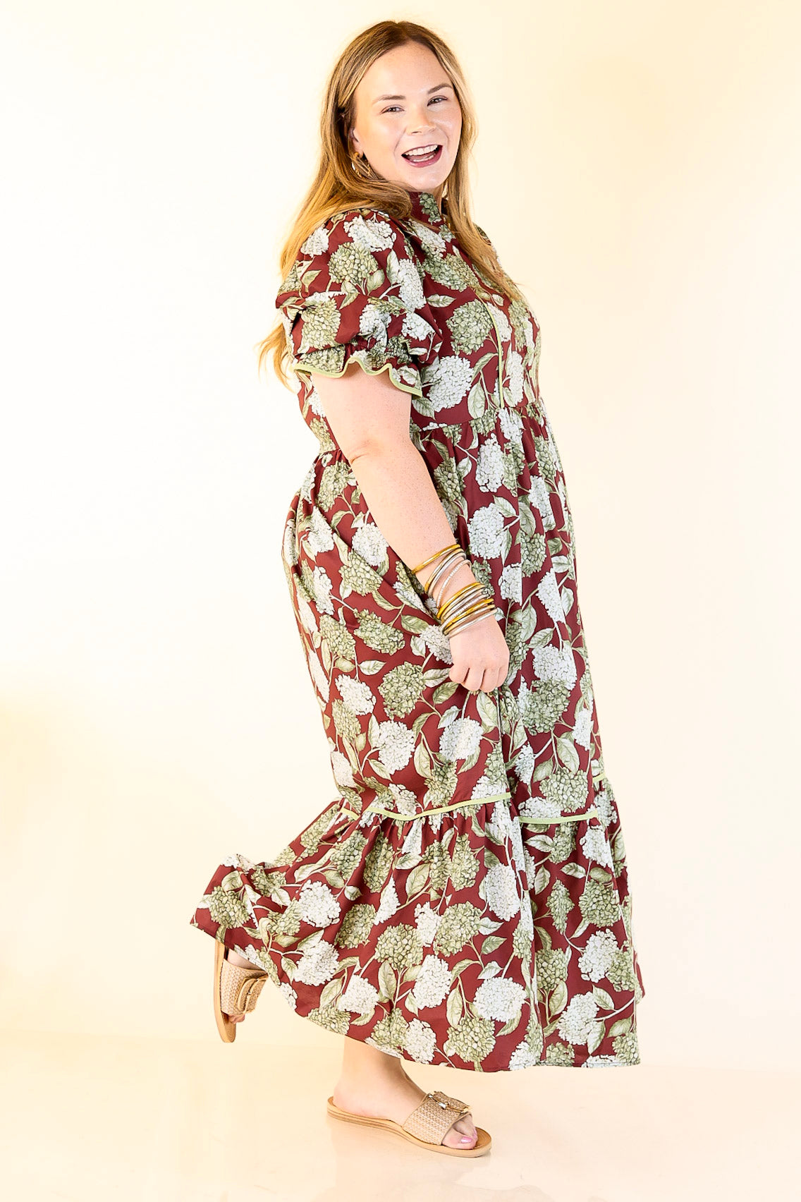 Petals & Poetry Hydrangea Floral Puff Sleeve Tiered Maxi Dress in Maroon