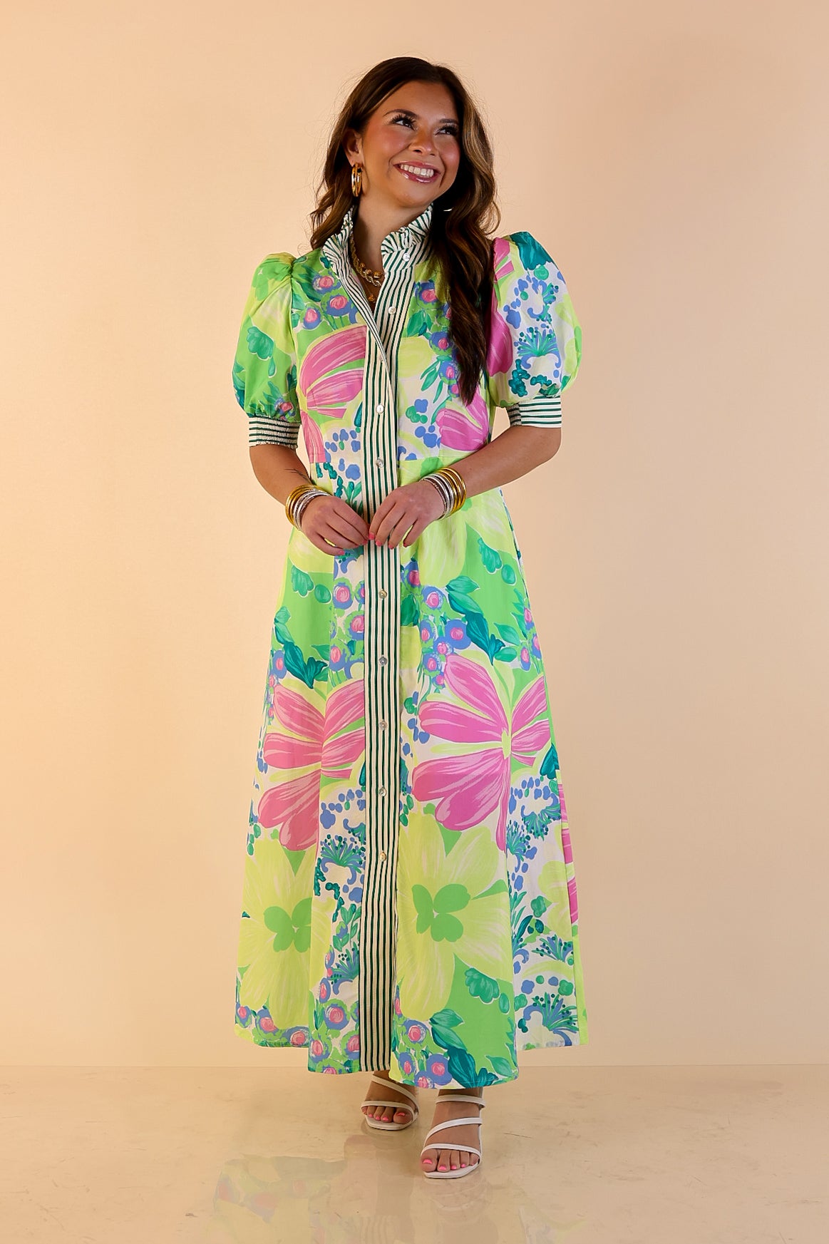 Spring Awakening Floral Midi Dress with Puff Sleeves and Stripe Trim in Lime Green and Blue