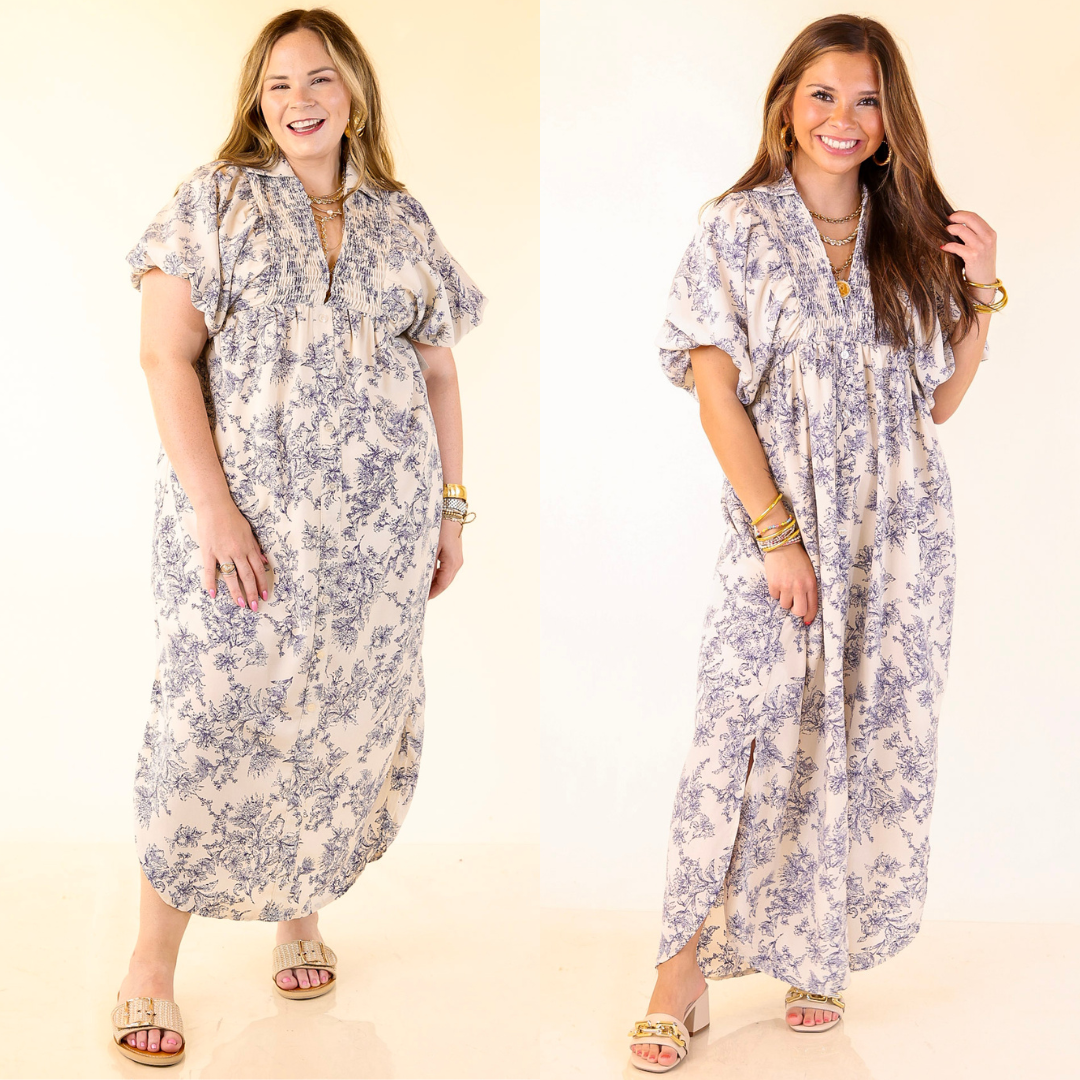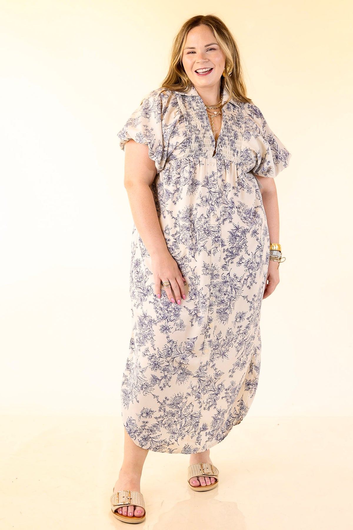 Timeless Blossom Floral Print Button Up Dress in Cream and Blue