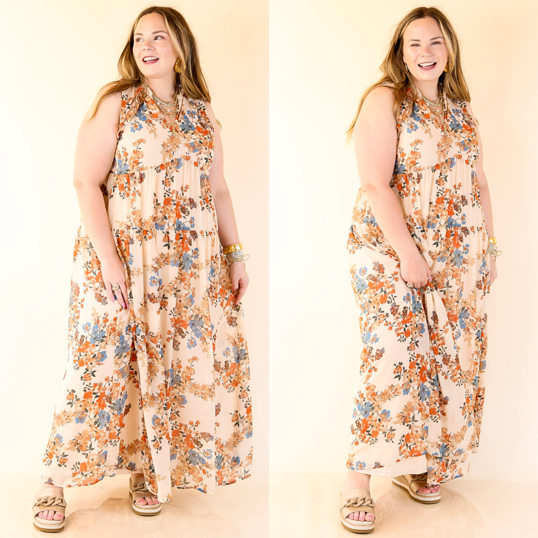 Twirl into Fall Notched Neck Tiered Floral Maxi Dress in Ivory