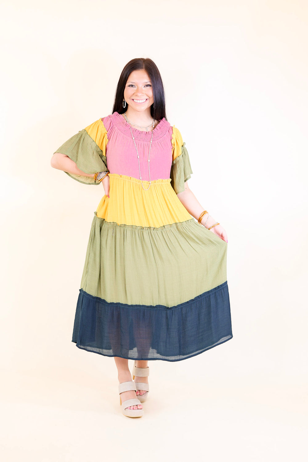 Strolling Down Sunset Floral Tiered Midi Dress in Pink and Green Mix