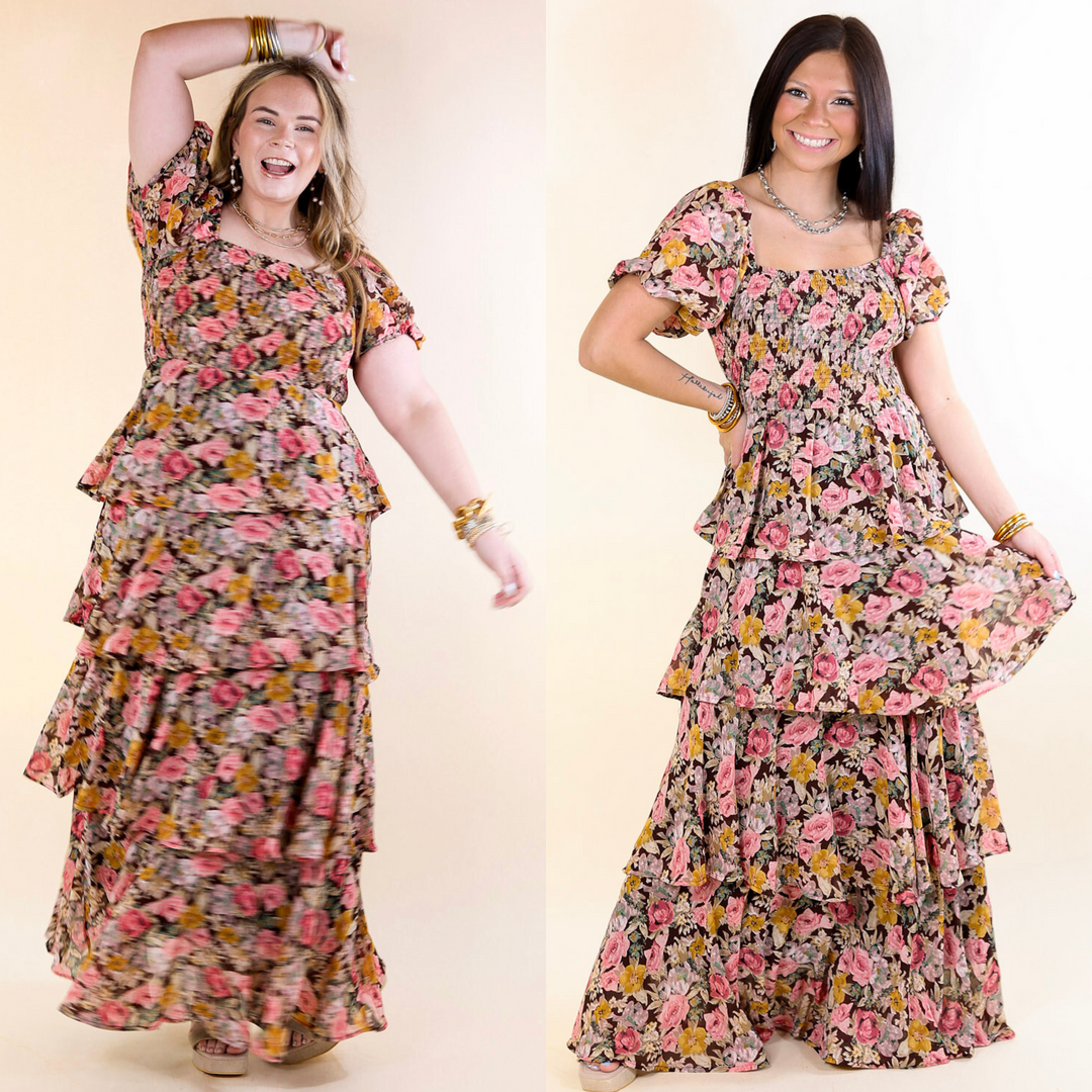 Fun Feeling Floral Tiered Maxi Dress with Smocked Balloon Sleeves in Yellow Mix