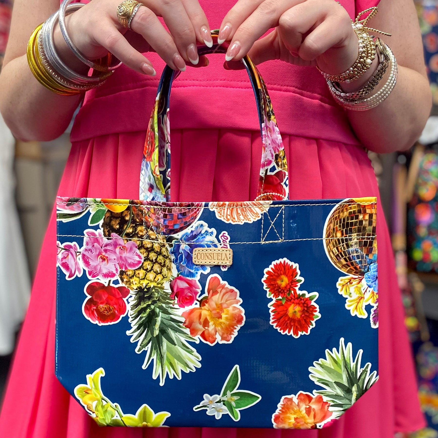 An unexpected still life of flowers, fruits and disco balls on a rich shade of indigo blue. This mini Bag was made for the little moments- carrying keys and a snack for a walk on the beach or lunch and a cold brew to the office. Folds neatly under your car seat. This bag made of easy-to-clean cloth and is the smallest of the tote favorites.