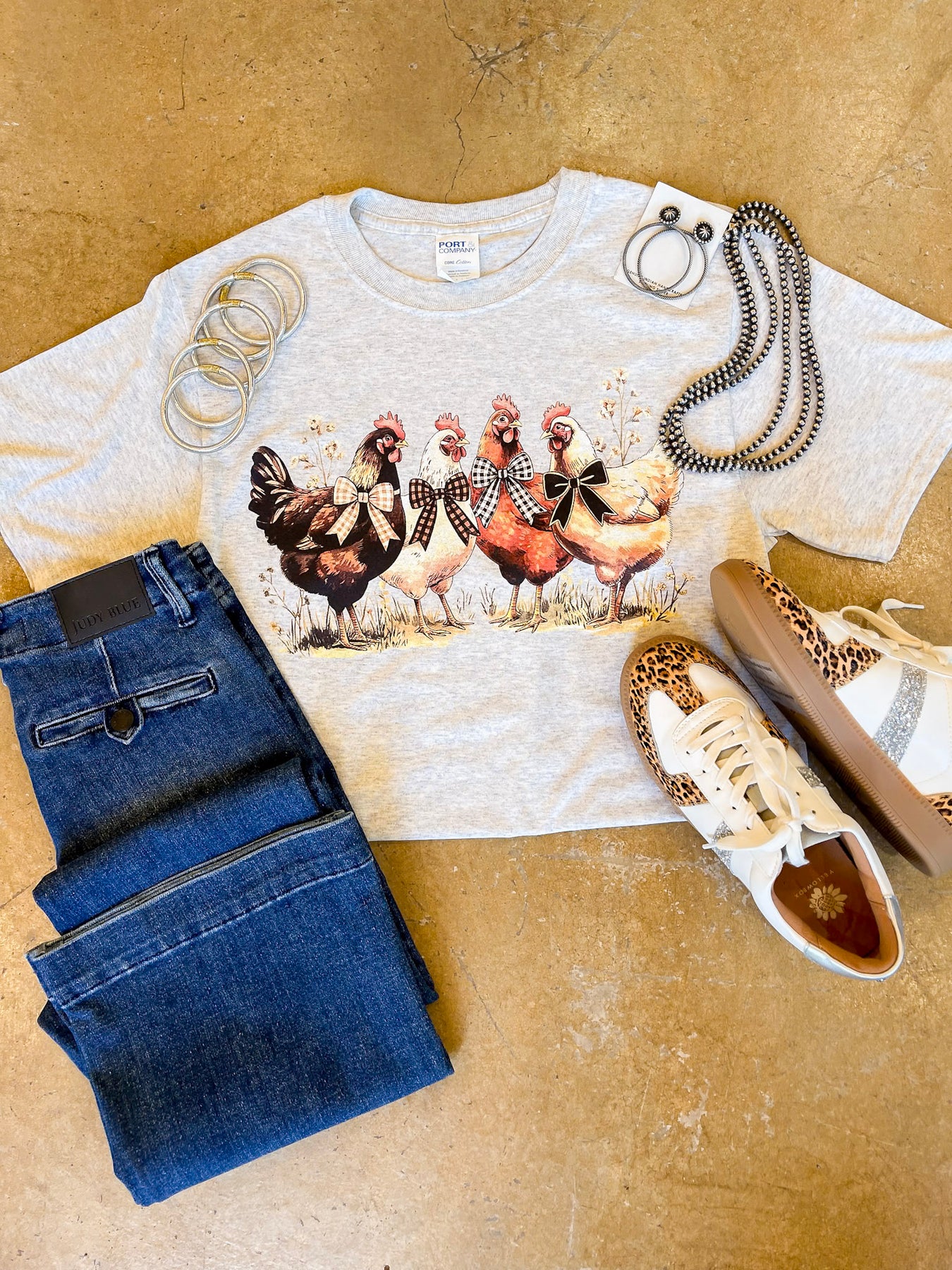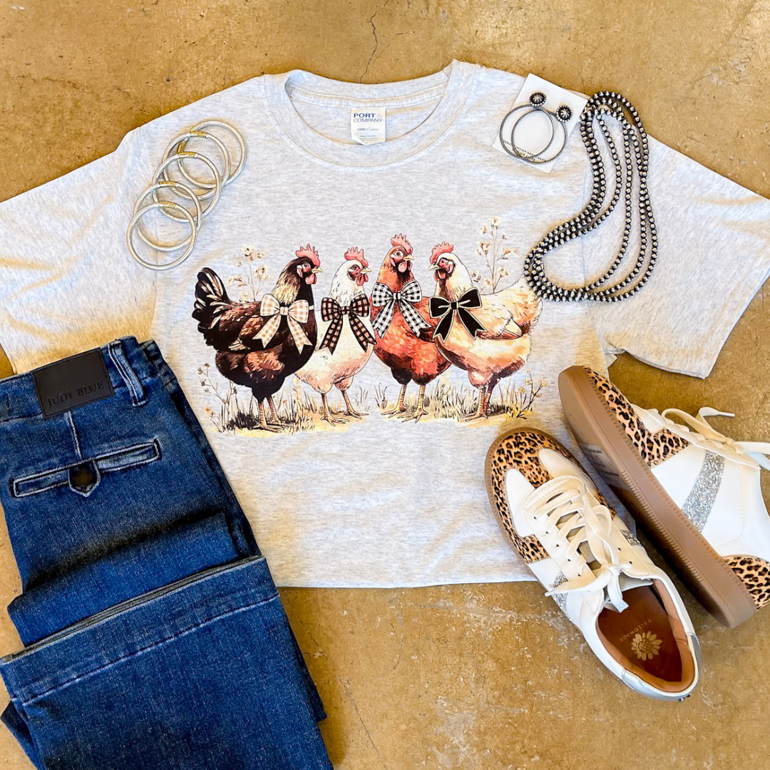 Celebrate a little farmhouse charm with our Barnyard Besties Graphic Tee! This heather grey t-shirt features four sweetly dressed chickens, each styled with bows and checkered accents, making it the perfect mix of rustic and playful. Designed with a unisex fit, soft cotton-blend fabric, and short sleeves, this tee is comfy for everyday wear and easy to style with denim, boots, or sneakers. Whether you’re headed to the farmer’s market, a backyard gathering, or just want to show your country-girl side, this tee brings personality and comfort all in one.