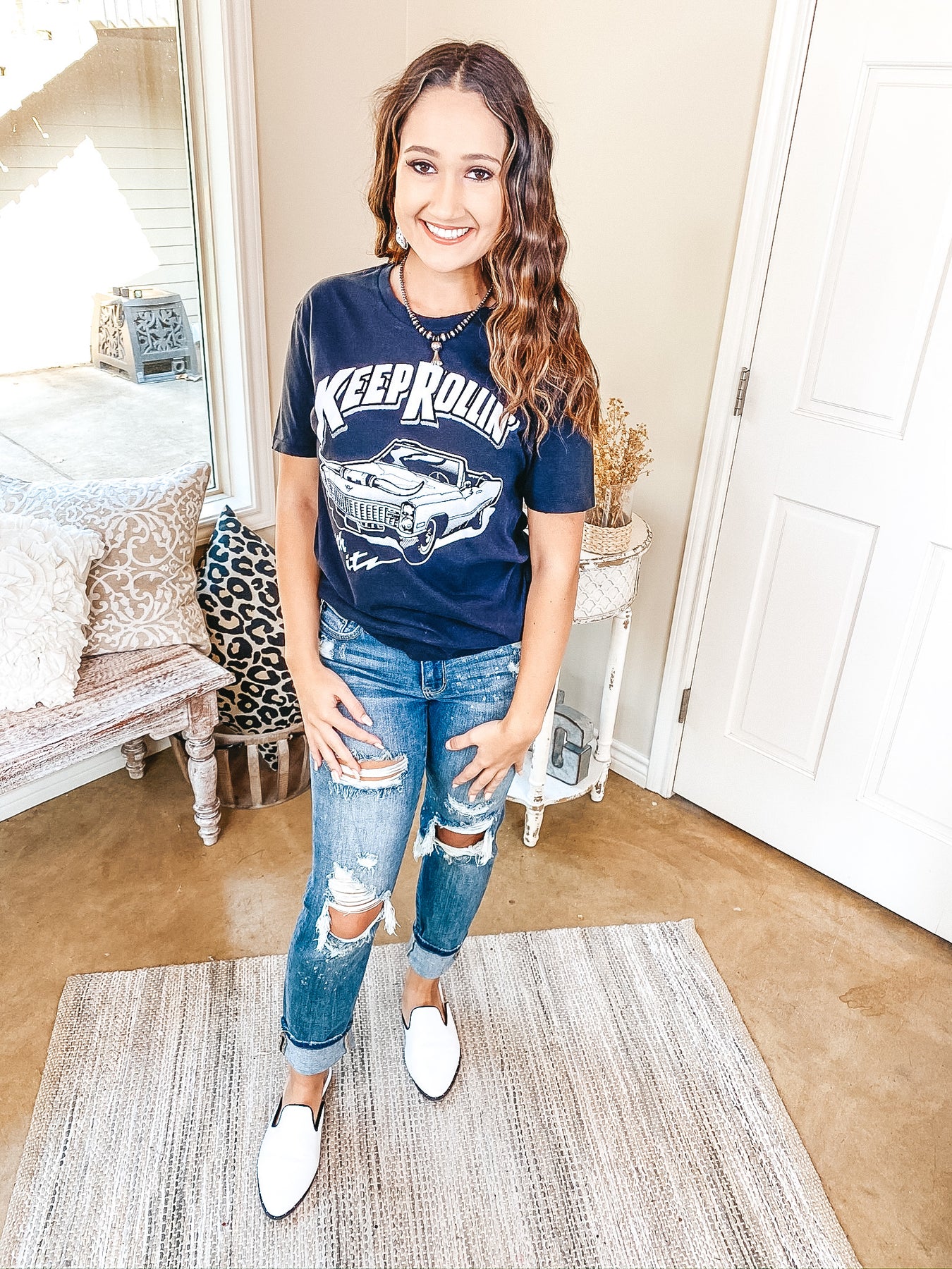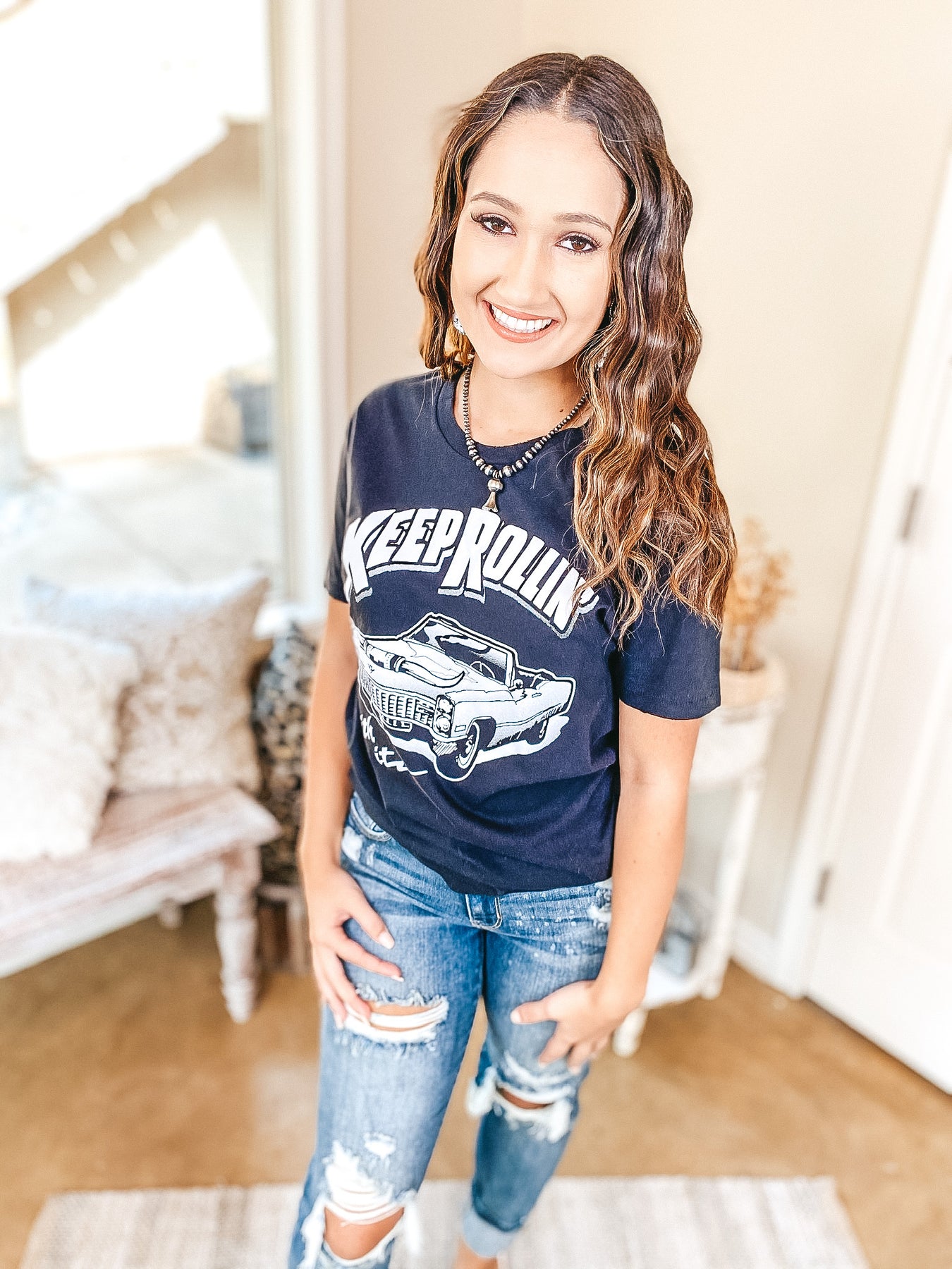 This graphic tee is such a trendy statement piece! It includes a black body with slight distressing on the edge of the neck, sleeves, and hem. The white graphic has an image of a classic convertible car with long horns on the grill, and the phrase "Keep Rolling with It." Lily is wearing a size small. Made in USA. Kourtney is wearing a size large. Abby is wearing a size XL.