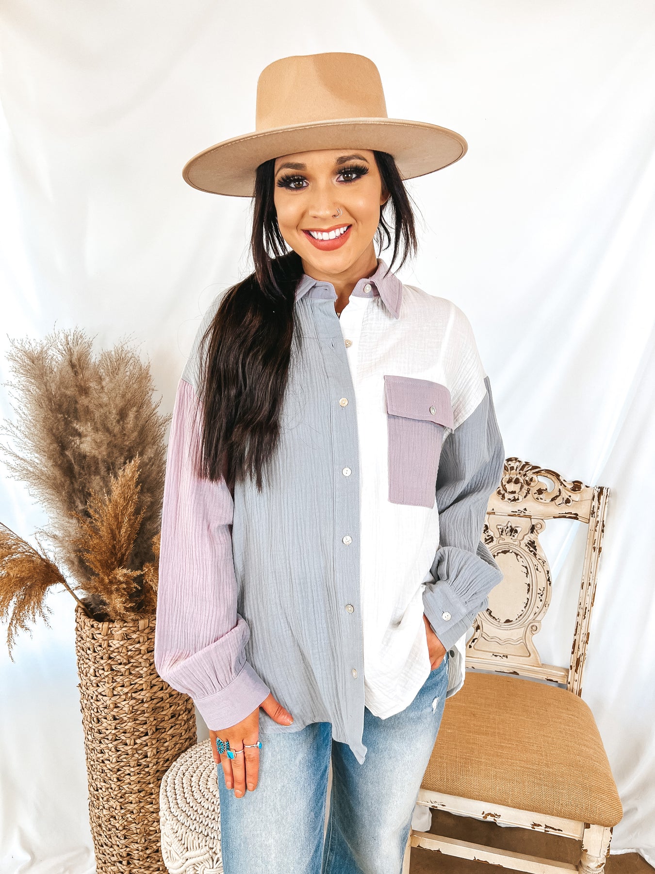 Last Chance Size Medium & 1XL | Highly Requested Button Up Color Block Top in Dusty Blue and Purple