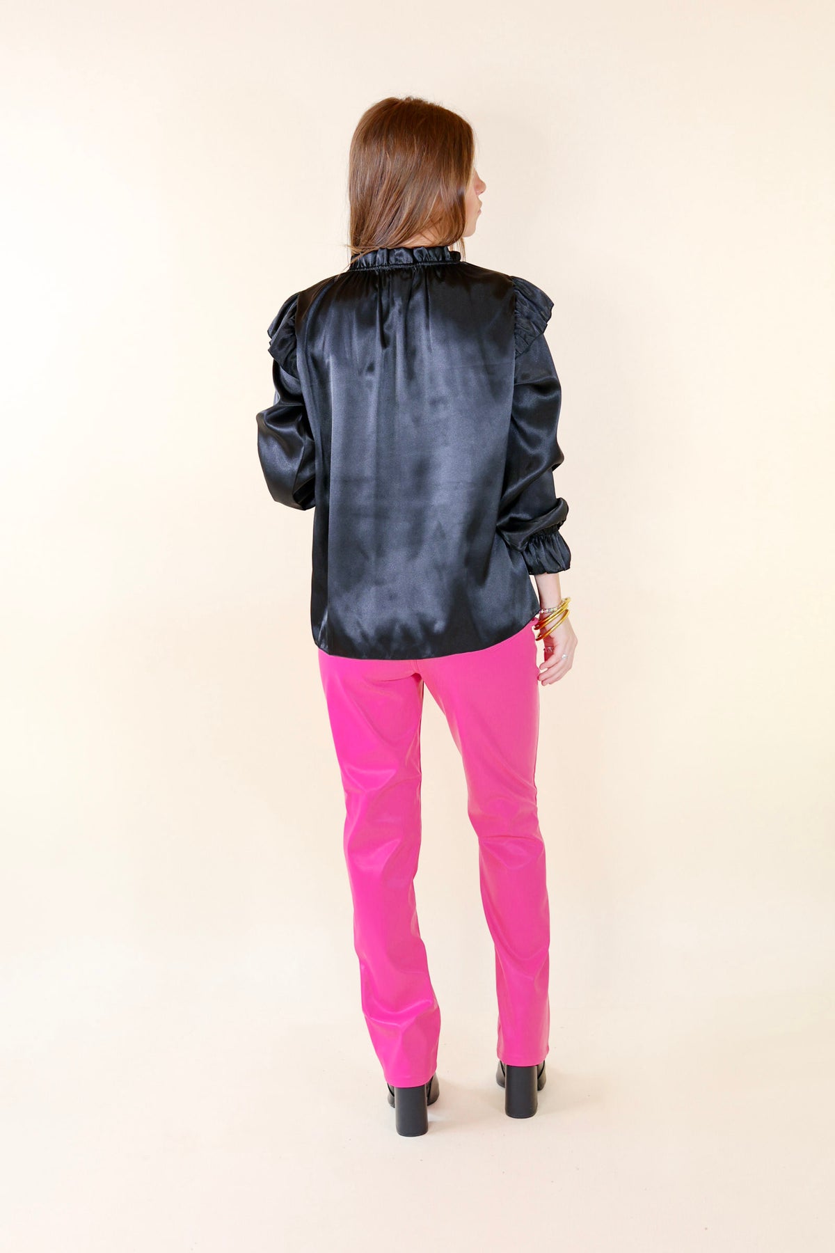 Can't Stop Me Ruffle Mock Neck Long Sleeve Satin Top in Black