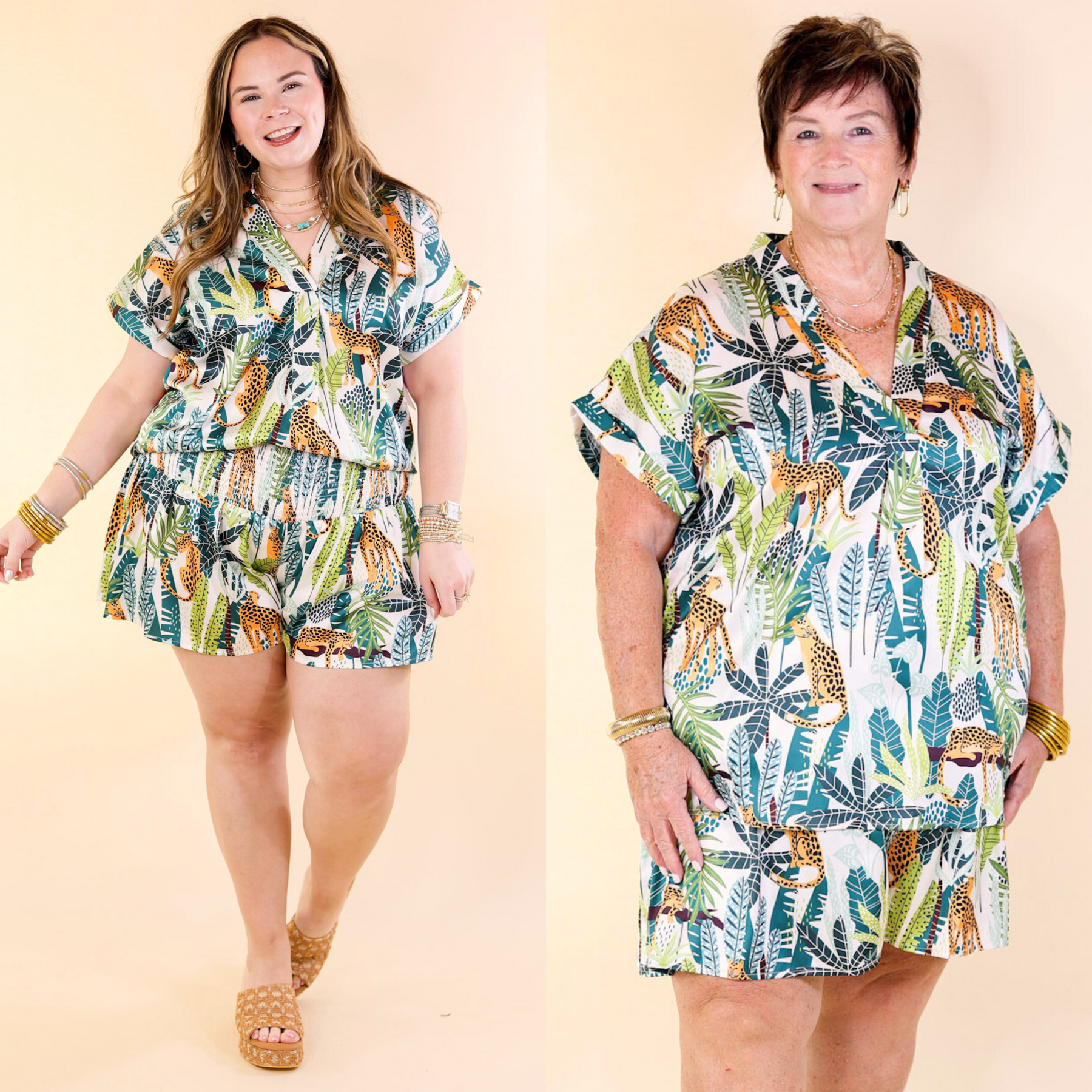 This white V-neck top has a fun and stylish jungle print featuring oranges leopards. It's complete with cuffed sleeves for a touch of sophistication. Make a statement whether you're strolling around town or just lounging at home! Make sure to grab the matching bottoms for a fun look!