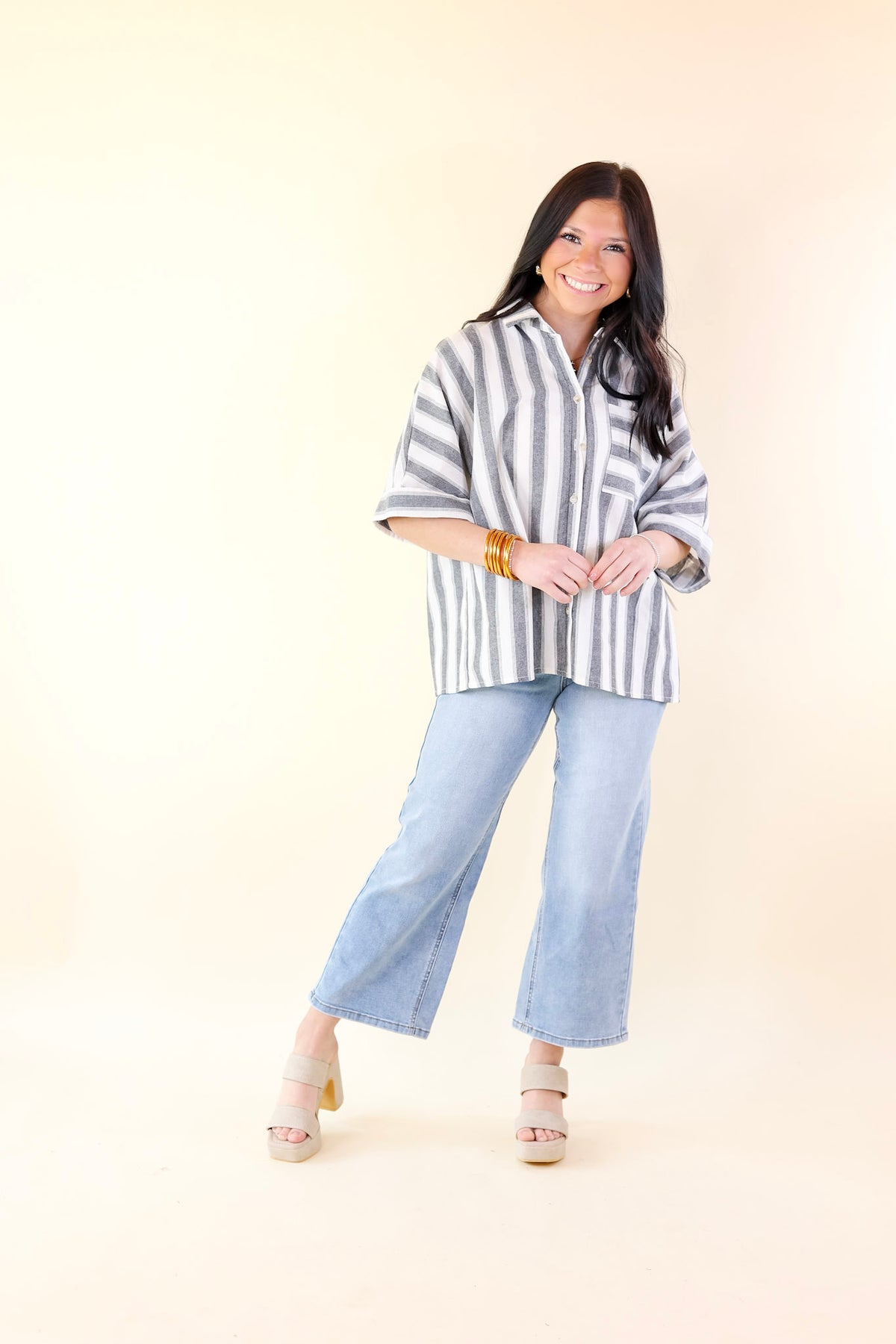 Down The Beach Button Up Striped Top in Ivory and Grey