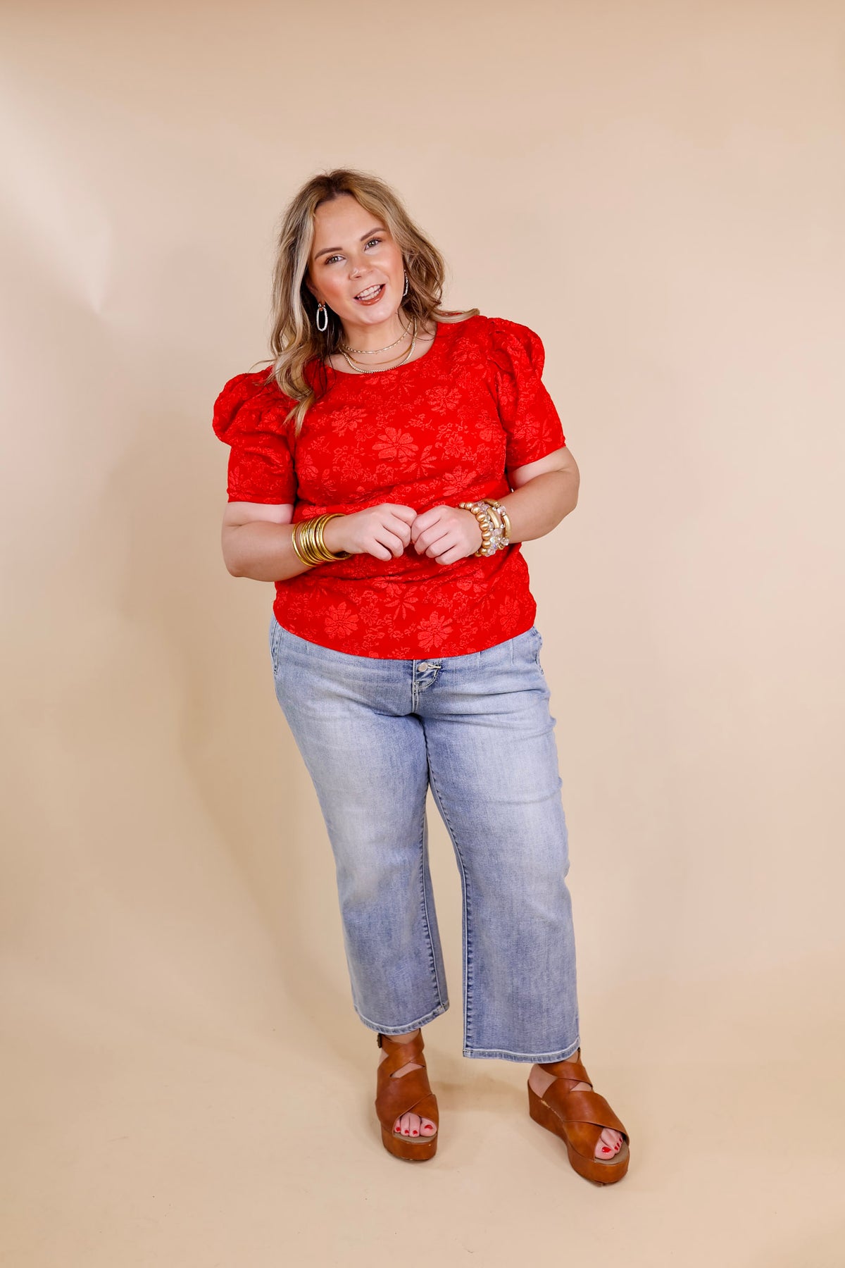 Last Chance Size Small | Fab Feeling Puff Shoulder Floral Embossed Top in Red