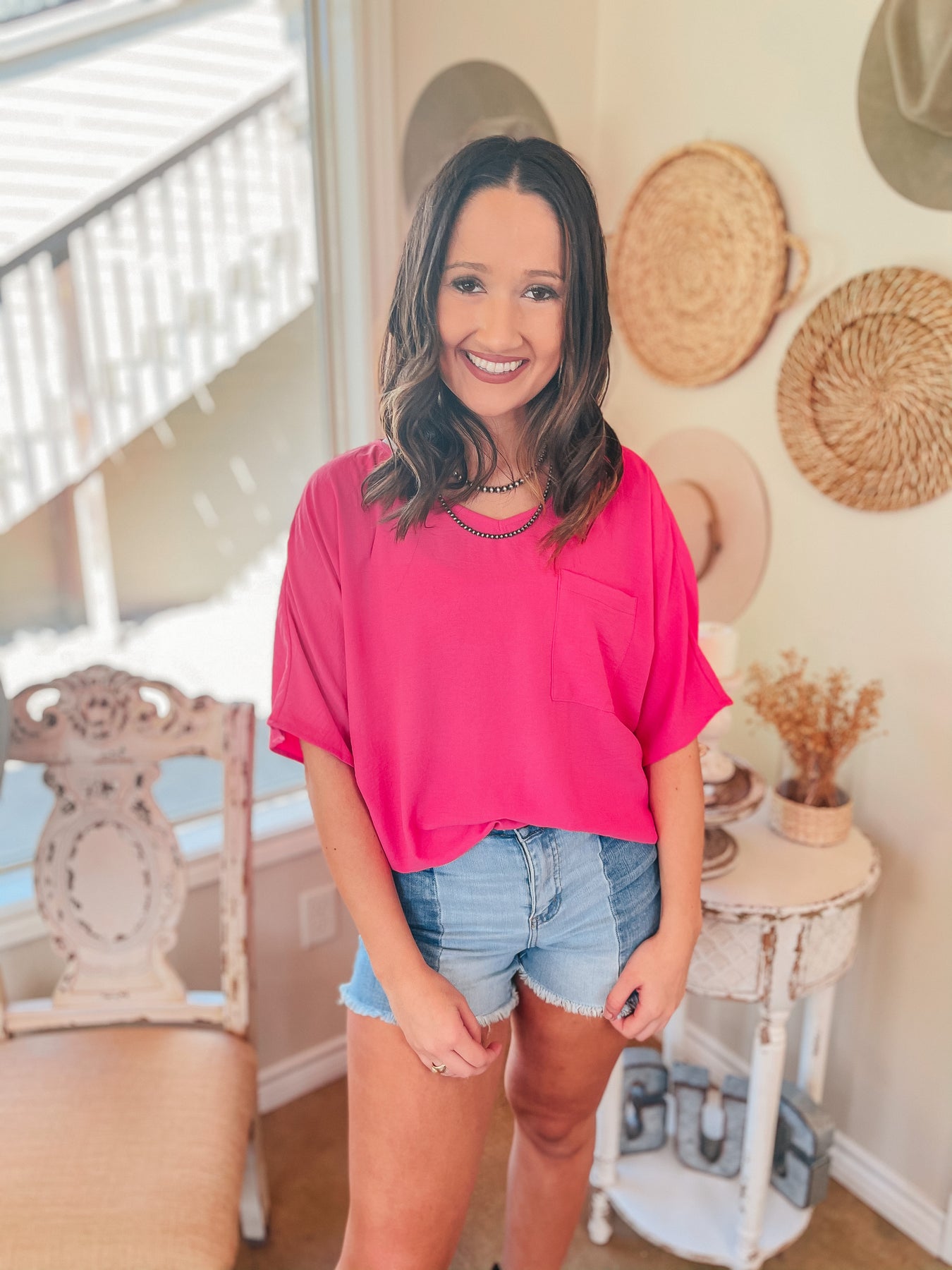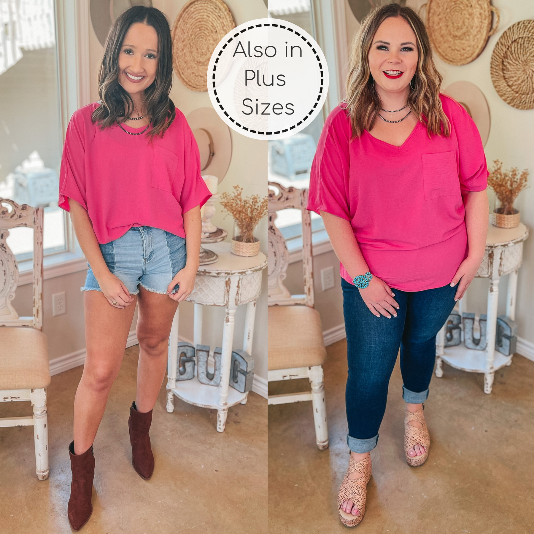Last Chance Size Small and 2XL | On Record V Neck Short Sleeve Shift Top with Front Pocket in Fuchsia
