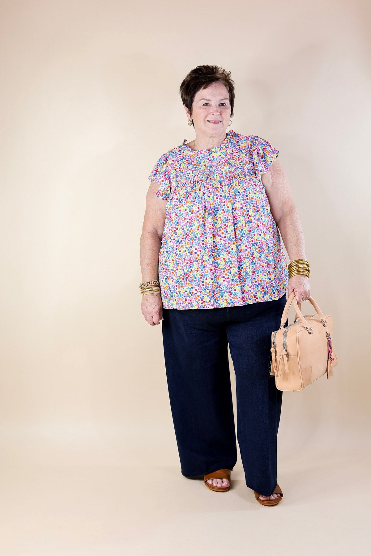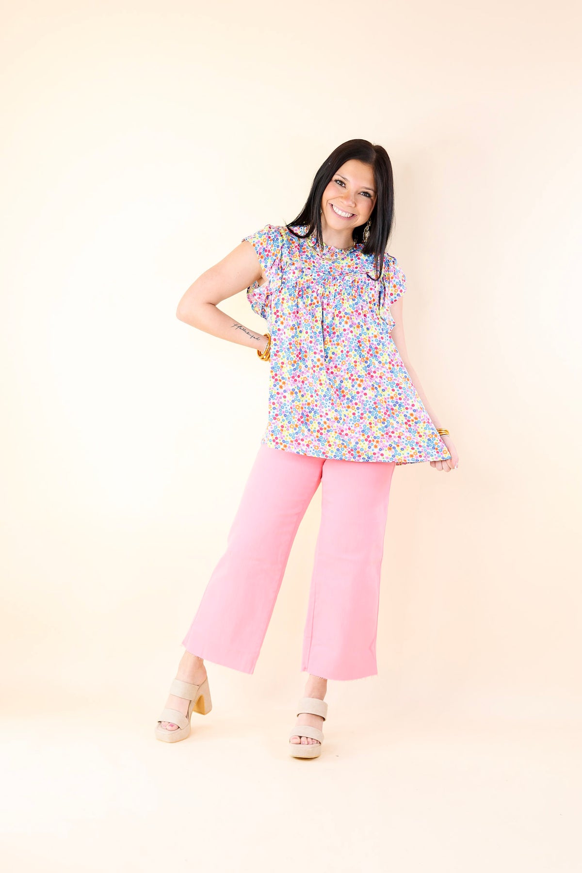 Fun Memories Floral Ruched Front Top with Ruffle Cap Sleeves in Blue Mix