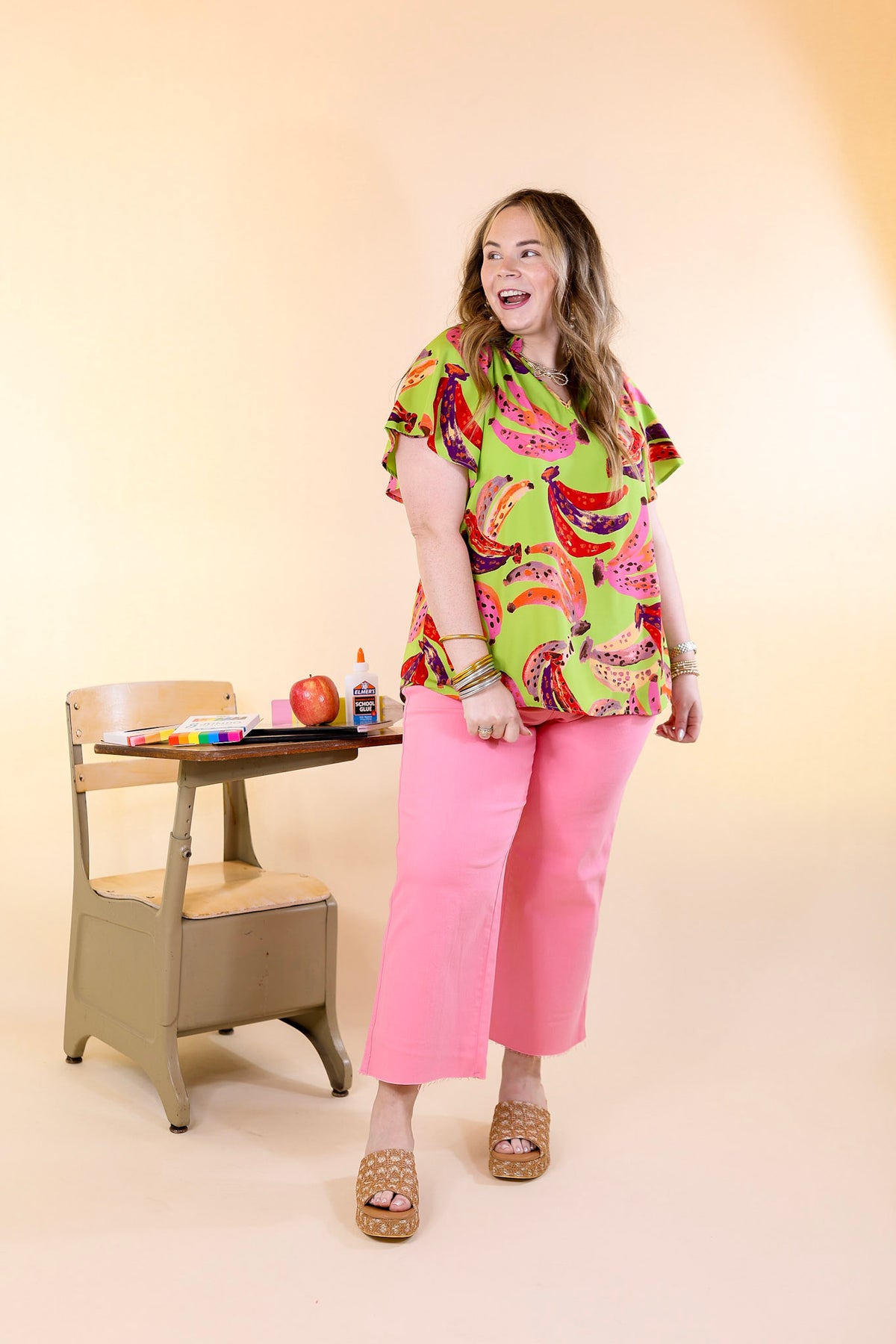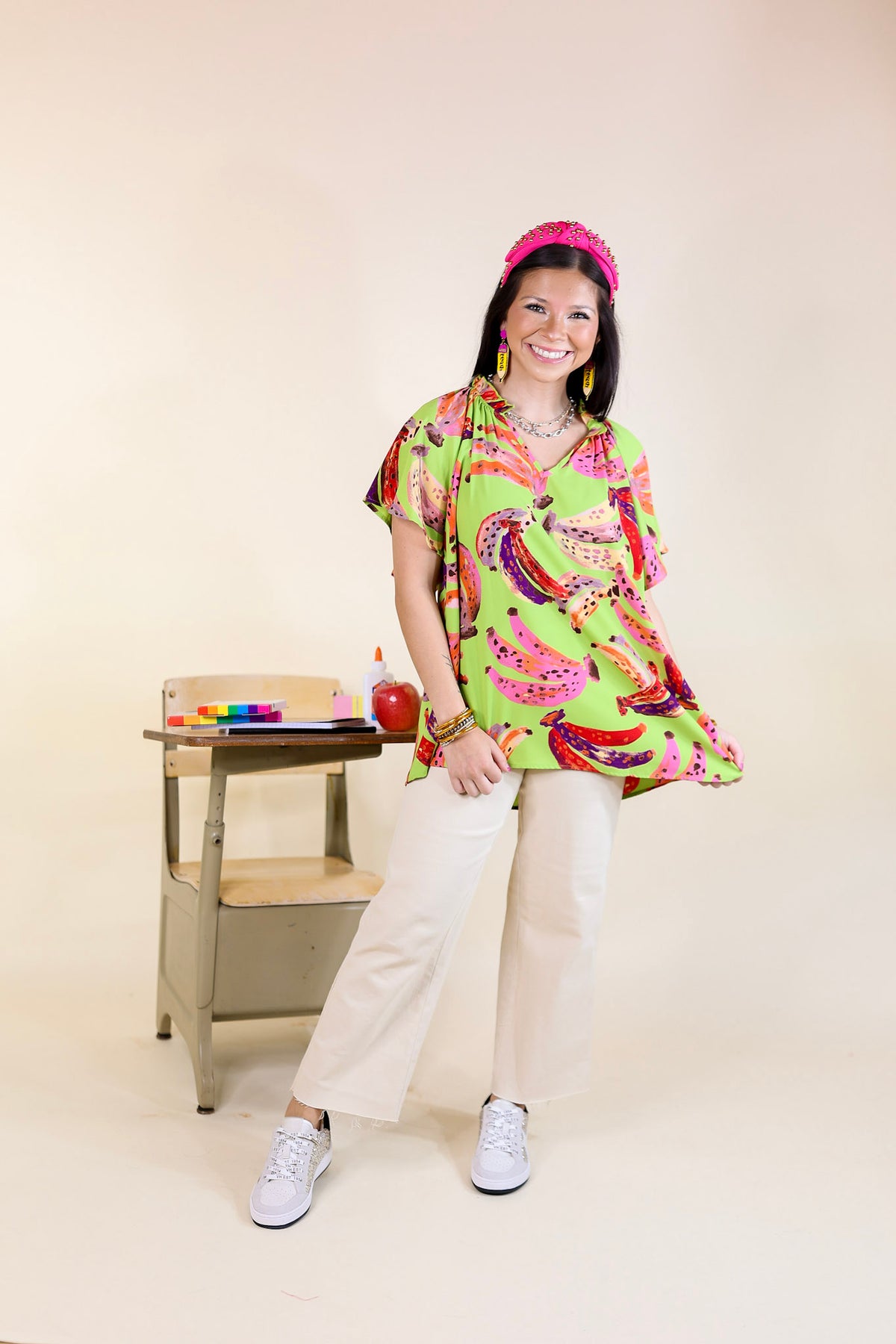 This Green with Envy top is making us bananas! With its adorable multicolor banana pattern and flowy sleeves, it'll have you feeling perky and stylish at your next summer outing. Show off your summer vibes with the v-neckline and ruffled collar.