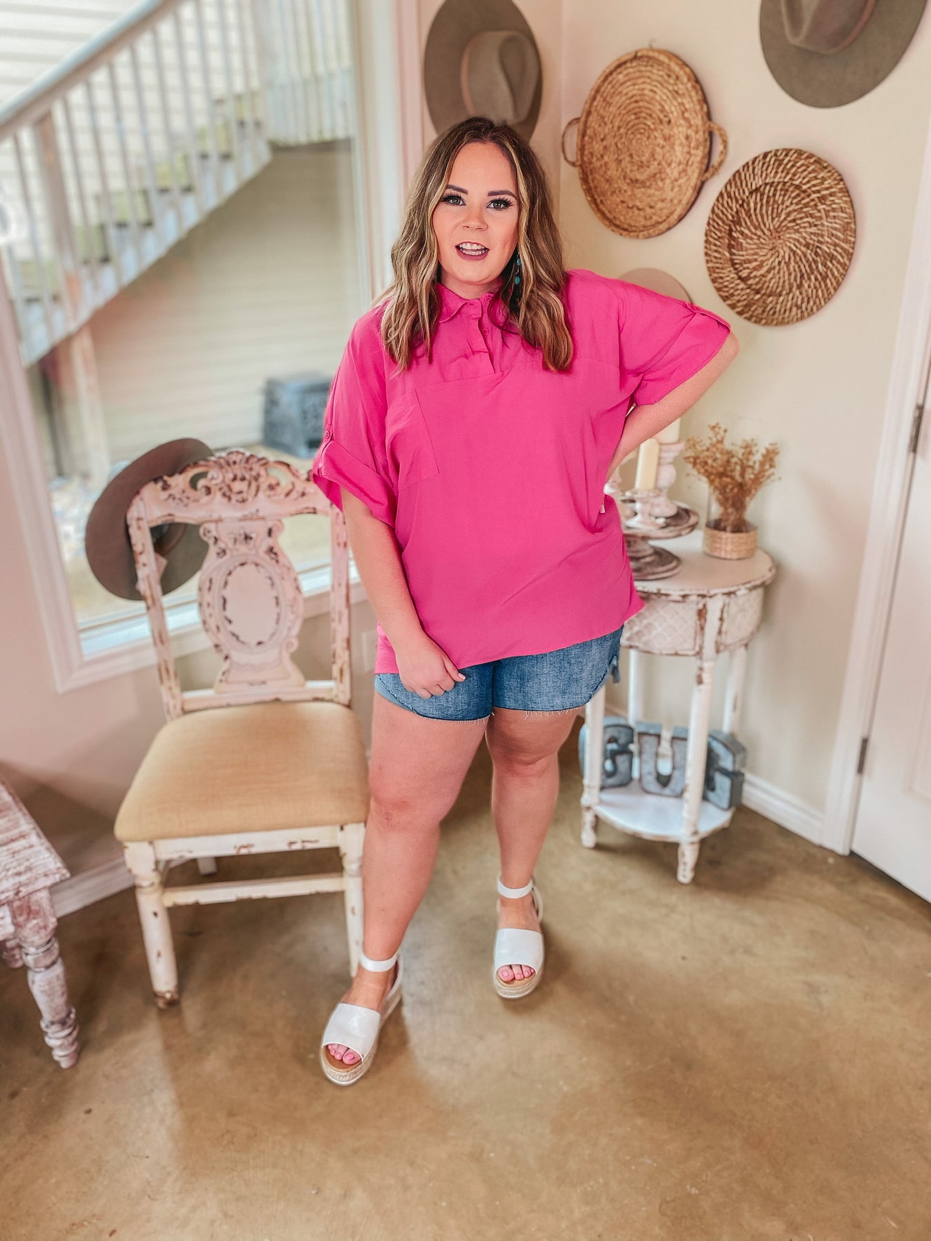 Chic Status Button and Collared Neckline Short Sleeve Top in Fuchsia