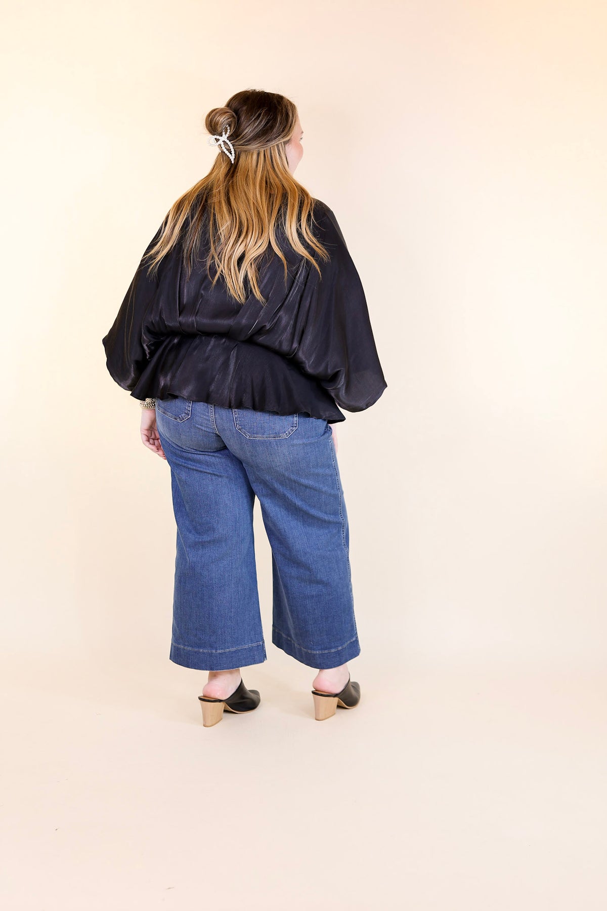 Hear the Music Drop Sleeve Satin V Neck Peplum Top in Shiny Black
